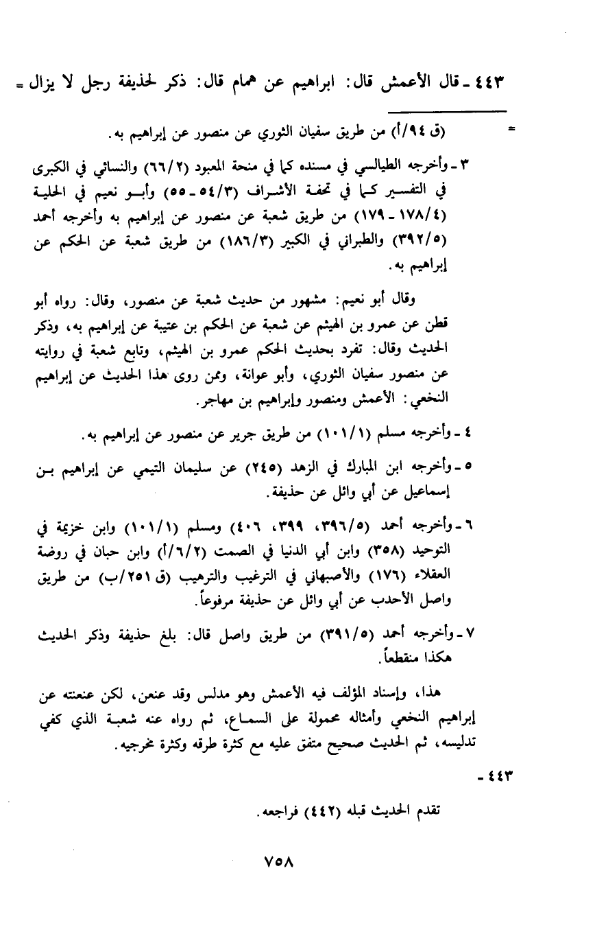 443 - قَالَ الْأَعْمَشُ قَالَ: إِبْرَاهِيمُ، عَنْ هُمَامٍ قَالَ: ذُكِرَ لِحُذَيْفَةَ رَجُلٌ لَا يَزَالُ -[759]- يَرْفَعُ الْحَدِيثَ إِلَى السُّلْطَانِ قَالَ: قَالَ رَسُولُ اللَّهِ صَلَّى اللهُ عَلَيْهِ وَسَلَّمَ: «§لَا يَدْخُلُ الْجَنَّةَ قَتَّاتٌ»