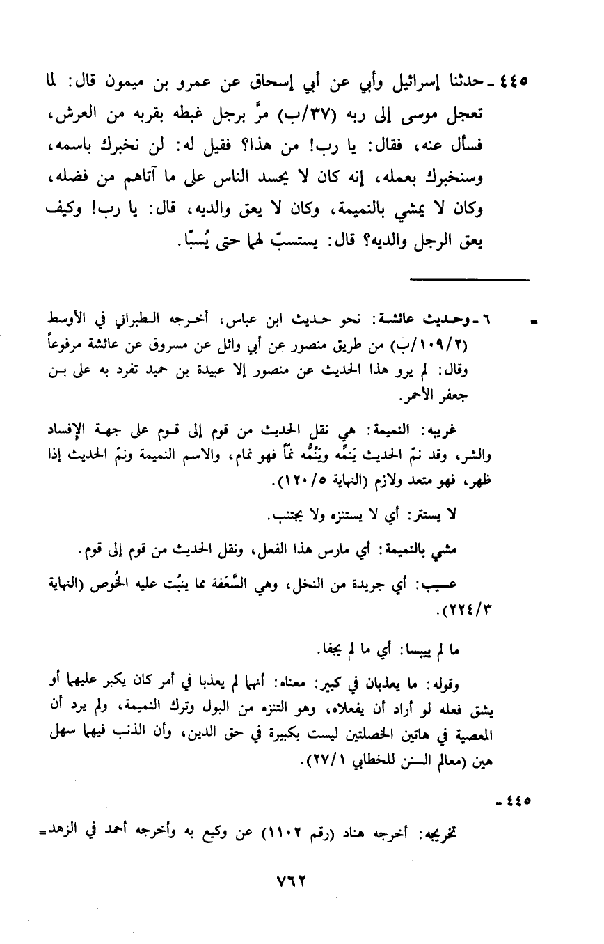 445 - حَدَّثَنَا إِسْرَائِيلُ وَأُبَيٌّ، عَنْ أَبِي إِسْحَاقَ، عَنْ عَمْرِو بْنِ مَيْمُونٍ قَالَ: لَمَّا تَعَجَّلَ مُوسَى إِلَى رَبِّهِ مَرَّ بِرَجُلٍ غَبَطَهُ بِقُرْبِهِ مِنَ الْعَرْشِ، فَسَأَلَ عَنْهُ، فَقَالَ: يَا رَبُّ مَنْ هَذَا؟ فَقِيلَ لَهُ: لَنْ نُخْبِرَكَ بِاسْمِهِ، وَسَنُخْبِرُكَ بِعَمَلِهِ، §إِنَّهُ كَانَ لَا يَحْسُدُ النَّاسَ عَلَى مَا آتَاهُمْ مِنْ فَضْلِهِ، وَكَانَ لَا يَمْشِي بِالنَّمِيمَةِ، وَكَانَ لَا يَعُقُّ وَالِدَيْهِ، قَالَ: يَا رَبُّ وَكَيْفَ يَعُقُّ الرَّجُلُ وَالِدَيْهِ؟ قَالَ: يَسْتَسِبُّ لَهُمَا حَتَّى يُسَبَّا "