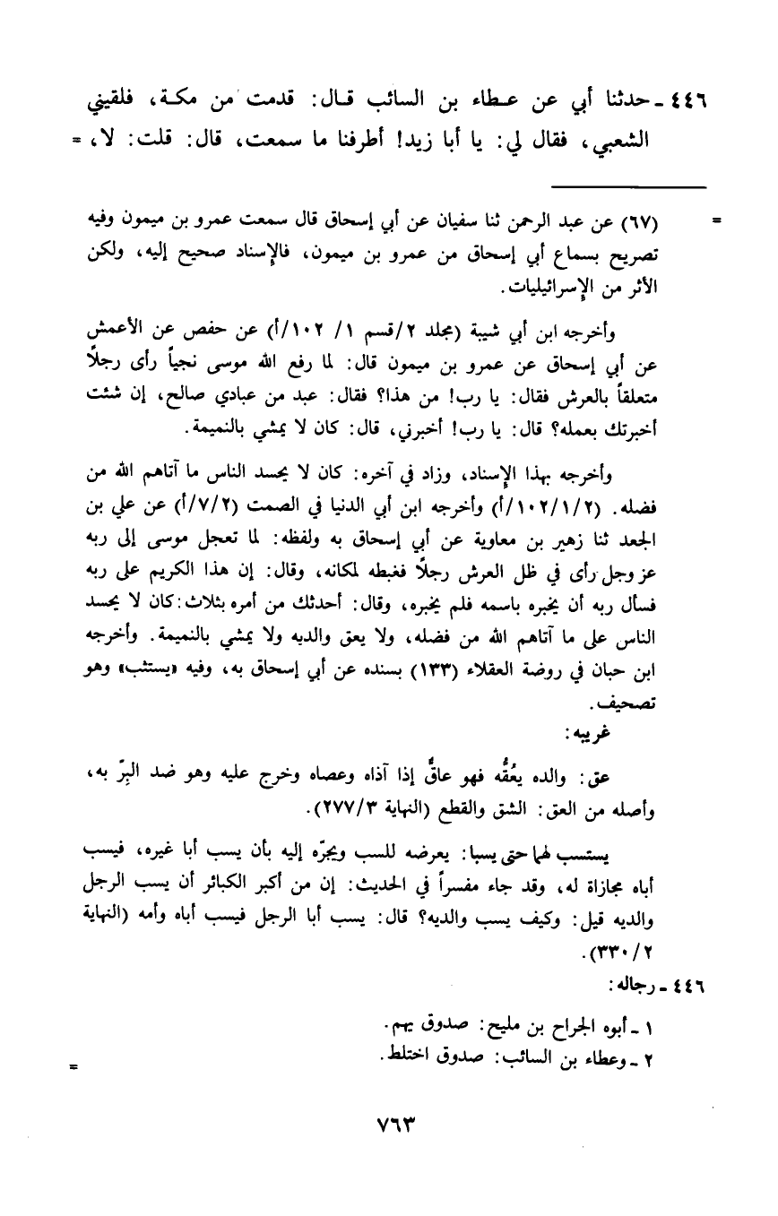 446 - حَدَّثَنَا أَبِي، عَنْ عَطَاءِ بْنِ السَّائِبِ قَالَ: قَدِمْتُ مِنْ مَكَّةَ، فَلَقِيَنِي الشَّعْبِيُّ، فَقَالَ لِي: يَا أَبَا زَيْدٍ أَطْرَفْنَا مَا سَمِعْتَ، قَالَ: قُلْتُ: لَا، -[764]- إِلَّا أَنِّي سَمِعْتُ عَبْدَ الرَّحْمَنِ بْنَ عَبْدِ اللَّهِ بْنِ سَابِطٍ يَقُولُ: «§لَا يَسْكُنُ مَكَّةَ سَافِكُ دَمٍ، وَلَا آكِلُ الرِّبَا، وَلَا مَشَّاءٌ بِنَمِيمٍ» ، قَالَ: فَعَجِبْتُ مِنْهُ حِينَ عَدَلَ النَّمِيمَةَ بِسَفْكِ الدَّمِ، وَأَكْلِ الرِّبَا، قَالَ: قَالَ الشَّعْبِيُّ: وَمَا تَعْجَبُ مِنْ ذَلِكَ؟ وَهَلْ تُسْفَكُ الدِّمَاءُ وَتُسْتَحَلُّ الْمَحَارِمُ إِلَّا بِالنَّمِيمَةِ