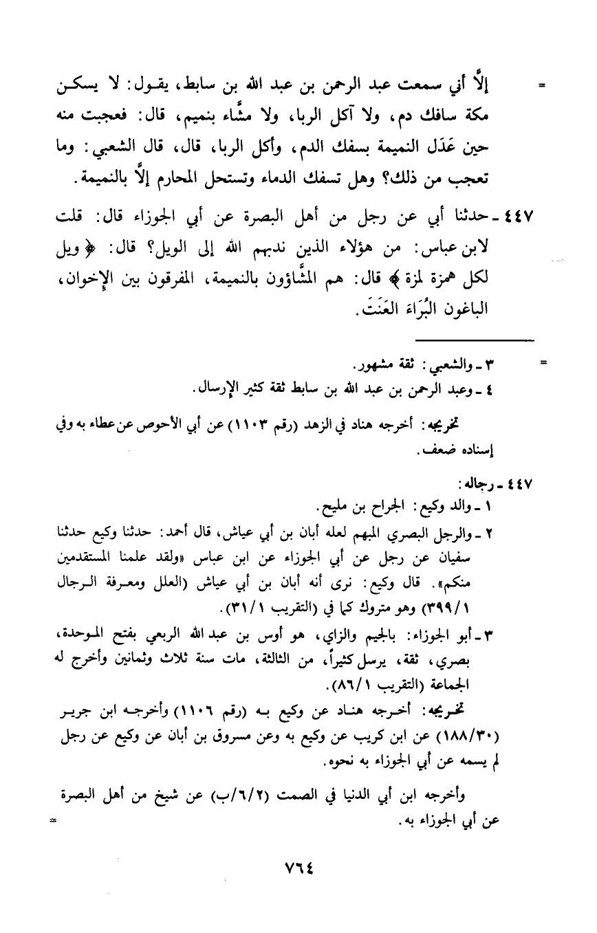 447 - حَدَّثَنَا أَبِي، عَنْ رَجُلٍ مِنْ أَهْلِ الْبَصْرَةِ، عَنْ أَبِي الْجَوْزَاءِ قَالَ: قُلْتُ لَابْنِ عَبَّاسٍ: مَنْ هَؤُلَاءِ الَّذِينَ نَدَبَهُمُ اللَّهُ إِلَى الْوَيْلِ؟ قَالَ: {وَيْلٌ لِكُلِّ هُمَزَةٍ لُمَزَةٍ} [الهمزة: 1] قَالَ: «§هُمُ الْمَشَّاؤُونَ بِالنَّمِيمَةِ، الْمُفَرِّقُونَ بَيْنَ الْإِخْوَانِ الْبَاغُونَ الْبُرَآءَ الْعَنَتَ»
