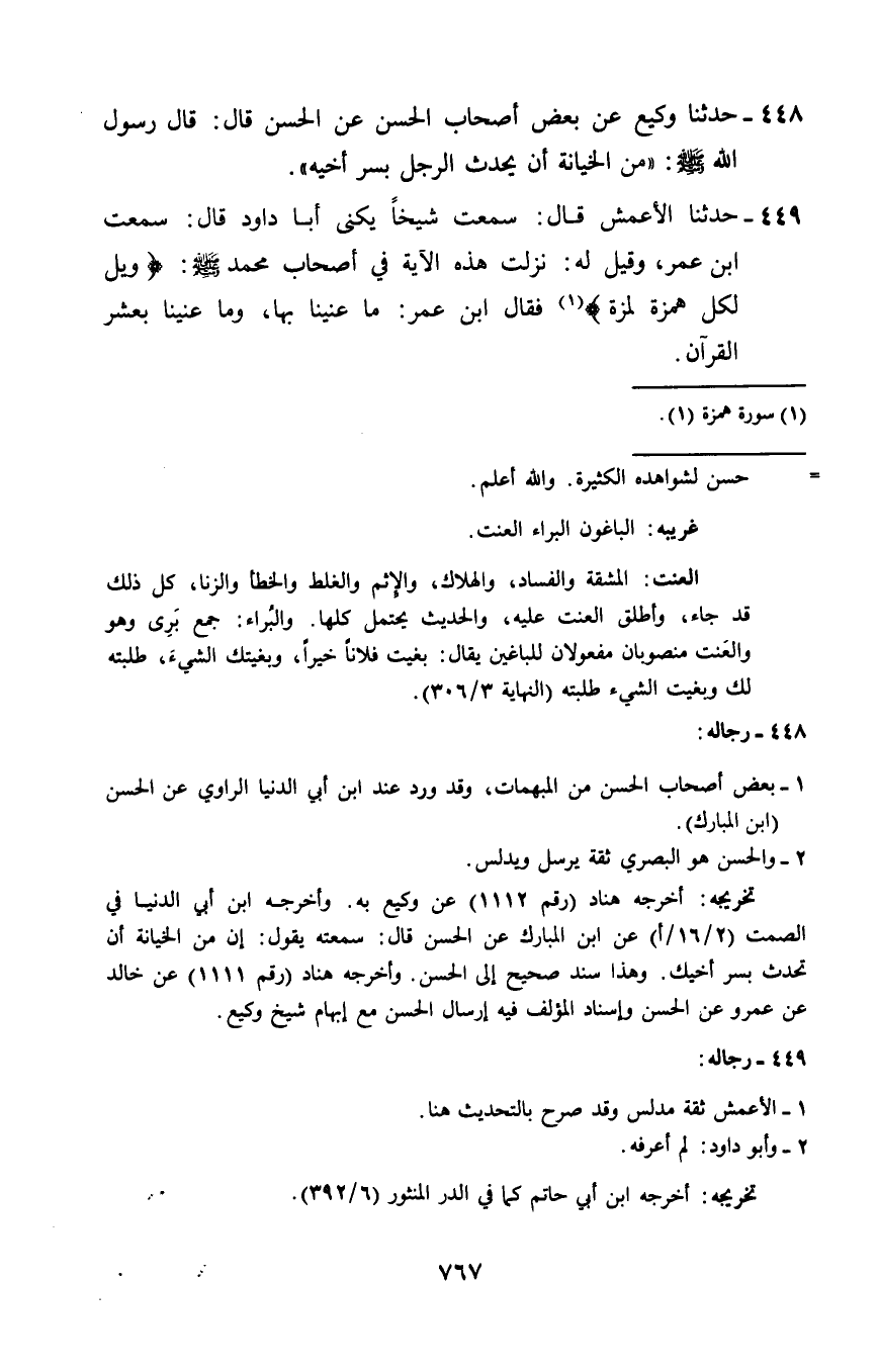 448 - حَدَّثَنَا وَكِيعٌ، عَنْ بَعْضِ أَصْحَابِ الْحَسَنِ، عَنِ الْحَسَنِ قَالَ: قَالَ رَسُولُ اللَّهِ صَلَّى اللهُ عَلَيْهِ وَسَلَّمَ «§مِنَ الْخِيَانَةِ أَنْ يُحَدِّثَ الرَّجُلُ بِسِرِّ أَخِيهِ»