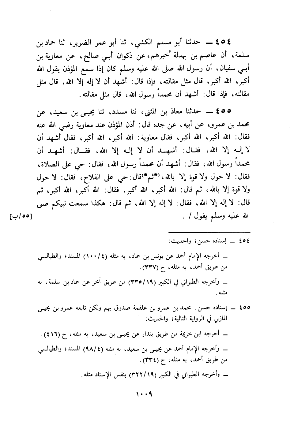 455- حَدَّثَنَا مُعَاذُ بْنُ الْمُثَنَّى، حَدَّثَنَا مُسَدَّدٌ، حَدَّثَنَا يَحْيَى بْنُ سَعِيدٍ، عَنْ مُحَمَّدِ بْنِ عَمْرٍو، عَنْ أَبِيهِ، عَنْ جَدِّهِ، قَالَ: أَذَّنَ الْمُؤَذِّنُ عِنْدَ مُعَاوِيَةَ رَضِيَ اللَّهُ عَنْهُ, فَقَالَ: اللَّهُ أَكْبَرُ اللَّهُ أَكْبَرُ، فَقَالَ مُعَاوِيَةُ: اللَّهُ أَكْبَرُ اللَّهُ أَكْبَرُ، فَقَالَ: أَشْهَدُ أَنْ لاَ إِلَهَ إِلاَّ اللَّهُ، فَقَالَ: أَشْهَدُ أَنْ لاَ إِلَهَ إِلاَّ اللَّهُ، فَقَالَ: أَشْهَدُ أَنَّ مُحَمَّدًا رَسُولُ اللهِ، فَقَالَ: أَشْهَدُ أَنَّ مُحَمَّدًا رَسُولُ اللهِ، فَقَالَ: حَيَّ عَلَى الصَّلاَةِ، فَقَالَ: لاَ حَوْلَ وَلاَ قُوَّةَ إِلاَّ بِاللهِ، ثُمَّ قَالَ: حَيَّ عَلَى الْفَلاَحِ، فَقَالَ: لاَ حَوْلَ وَلاَ قُوَّةَ إِلاَّ بِاللهِ، ثُمَّ قَالَ: اللَّهُ أَكْبَرُ اللَّهُ أَكْبَرُ، فَقَالَ: اللَّهُ أَكْبَرُ اللَّهُ أَكْبَرُ، ثُمَّ قَالَ: لاَ إِلَهَ إِلاَّ اللَّهُ، فَقَالَ: لاَ إِلَهَ إِلاَّ اللَّهُ، ثُمَّ قَالَ: هَكَذَا سَمِعْتُ نَبِيَّكُمْ صَلى الله عَلَيه وَسَلم يَقُولُ.