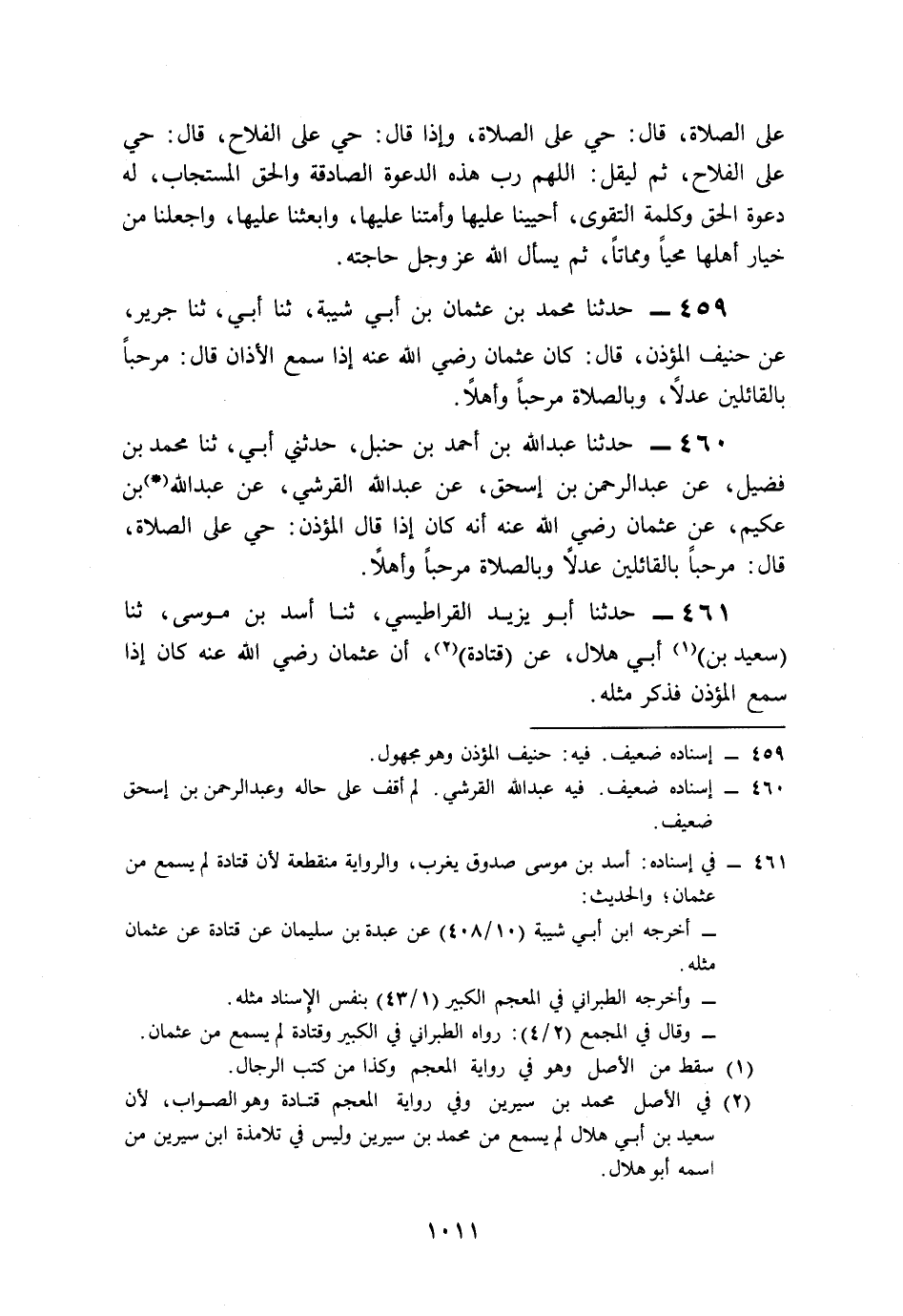 460- حَدَّثَنَا عَبْدُ اللهِ بْنُ أَحْمَدَ بْنِ حَنْبَلٍ، حَدَّثَنِي أَبِي، حَدَّثَنَا مُحَمَّدُ بْنُ فُضَيْلٍ، عَنْ عَبْدِ الرَّحْمَنِ بْنِ إِسْحَاقَ، عَنْ عَبْدِ اللهِ الْقُرَشِيِّ، عَنْ عَبْدِ اللهِ بْنِ عُكَيْمٍ، عَنْ عُثْمَانَ، رَضِيَ اللَّهُ عَنْهُ, أَنَّهُ كَانَ إِذَا قَالَ الْمُؤَذِّنُ: حَيَّ عَلَى الصَّلاَةِ، قَالَ: مَرْحَبًا بِالْقَائِلِينَ عَدْلاً، وَبِالصَّلاَةِ مَرْحَبًا وَأَهْلاً.