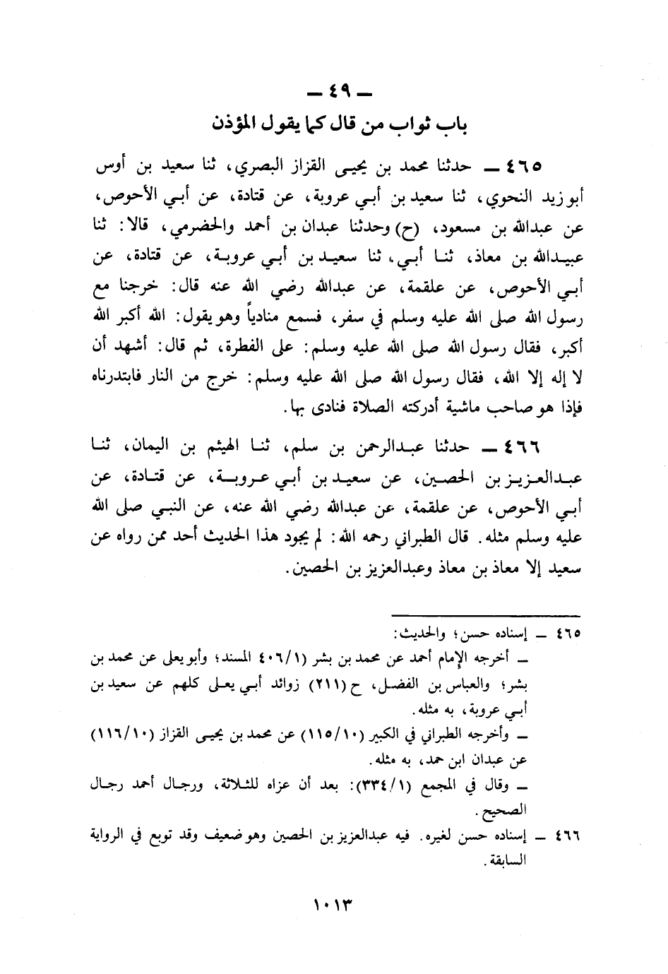 465- حَدَّثَنَا مُحَمَّدُ بْنُ يَحْيَى الْقَزَّازُ الْبَصْرِيُّ، حَدَّثَنَا سَعِيدُ بْنُ أَوْسٍ, أَبُو زَيْدٍ النَّحْوِيُّ، حَدَّثَنَا سَعِيدُ بْنُ أَبِي عَرُوبَةَ، عَنْ قَتَادَةَ، عَنْ أَبِي الأَحْوَصِ، عَنْ عَبْدِ اللهِ بْنِ مَسْعُودٍ (ح) وَحَدَّثَنَا عَبْدَانُ بْنُ أَحْمَدَ، وَالْحَضْرَمِيُّ، قَالاَ: حَدَّثَنَا عُبَيْدُ اللهِ بْنُ مُعَاذٍ، حَدَّثَنَا أَبِي، حَدَّثَنَا سَعِيدُ بْنُ أَبِي عَرُوبَةَ، عَنْ قَتَادَةَ، عَنْ أَبِي الأَحْوَصِ، عَنْ عَلْقَمَةَ، عَنْ عَبْدِ اللهِ، رَضِيَ اللَّهُ عَنْهُ قَالَ: خَرَجْنَا مَعَ رَسُولِ اللهِ صَلى الله عَلَيه وَسَلم فِي سَفَرٍ, فَسَمِعَ مُنَادِيًا وَهُوَ يَقُولُ: اللَّهُ أَكْبَرُ اللَّهُ أَكْبَرُ، فَقَالَ رَسُولُ اللهِ صَلى الله عَلَيه وَسَلم: عَلَى الْفِطْرَةِ, ثُمَّ قَالَ: أَشْهَدُ أَنْ لاَ إِلَهَ إِلاَّ اللَّهُ، فَقَالَ رَسُولُ اللهِ صَلى الله عَلَيه وَسَلم: خَرَجَ مِنَ النَّارِ, فَابْتَدَرْنَاهُ, فَإِذَا هُوَ صَاحِبُ مَاشِيَةٍ أَدْرَكَتْهُ الصَّلاَةُ, فَنَادَى بِهَا.