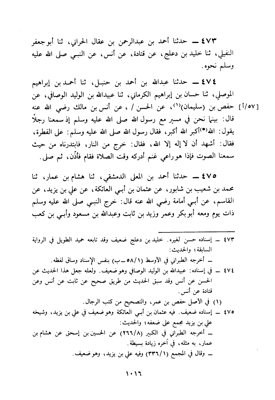 474- حَدَّثَنَا عَبْدُ اللهِ بْنُ أَحْمَدَ بْنِ حَنْبَلٍ، حَدَّثَنَا أَحْمَدُ بْنُ إِبْرَاهِيمَ الْمَوْصِلِيُّ، حَدَّثَنَا حَسَّانُ بْنُ إِبْرَاهِيمَ الْكَرْمَانِيُّ، حَدَّثَنَا عُبَيْدُ اللهِ بْنُ الْوَلِيدِ الْوَصَّافِيُّ، عَنْ حَفْصِ بْنِ سُلَيْمَانَ، عَنِ الْحَسَنِ، عَنْ أَنَسِ بْنِ مَالِكٍ، رَضِيَ اللَّهُ عَنْهُ قَالَ: بَيْنَمَا نَحْنُ فِي مَسِيرٍ مَعَ رَسُولِ اللهِ صَلى الله عَلَيه وَسَلم, إِذْ سَمِعْنَا رَجُلاً يَقُولُ: اللَّهُ أَكْبَرُ اللَّهُ أَكْبَرُ، فَقَالَ رَسُولُ اللهِ صَلى الله عَلَيه وَسَلم: عَلَى الْفِطْرَةِ, فَقَالَ: أَشْهَدُ أَنْ لاَ إِلَهَ إِلاَّ اللَّهُ، فَقَالَ: خَرَجَ مِنَ النَّارِ, فَابْتَدَرْنَاهُ مِنْ حَيْثِ سَمِعْنَا الصَّوْتَ, فَإِذَا هُوَ رَاعِي غَنَمٍ, أَدْرَكَهُ وَقْتُ الصَّلاَةِ, فَقَامَ فَأَذَّنَ ثُمَّ صَلَّى.