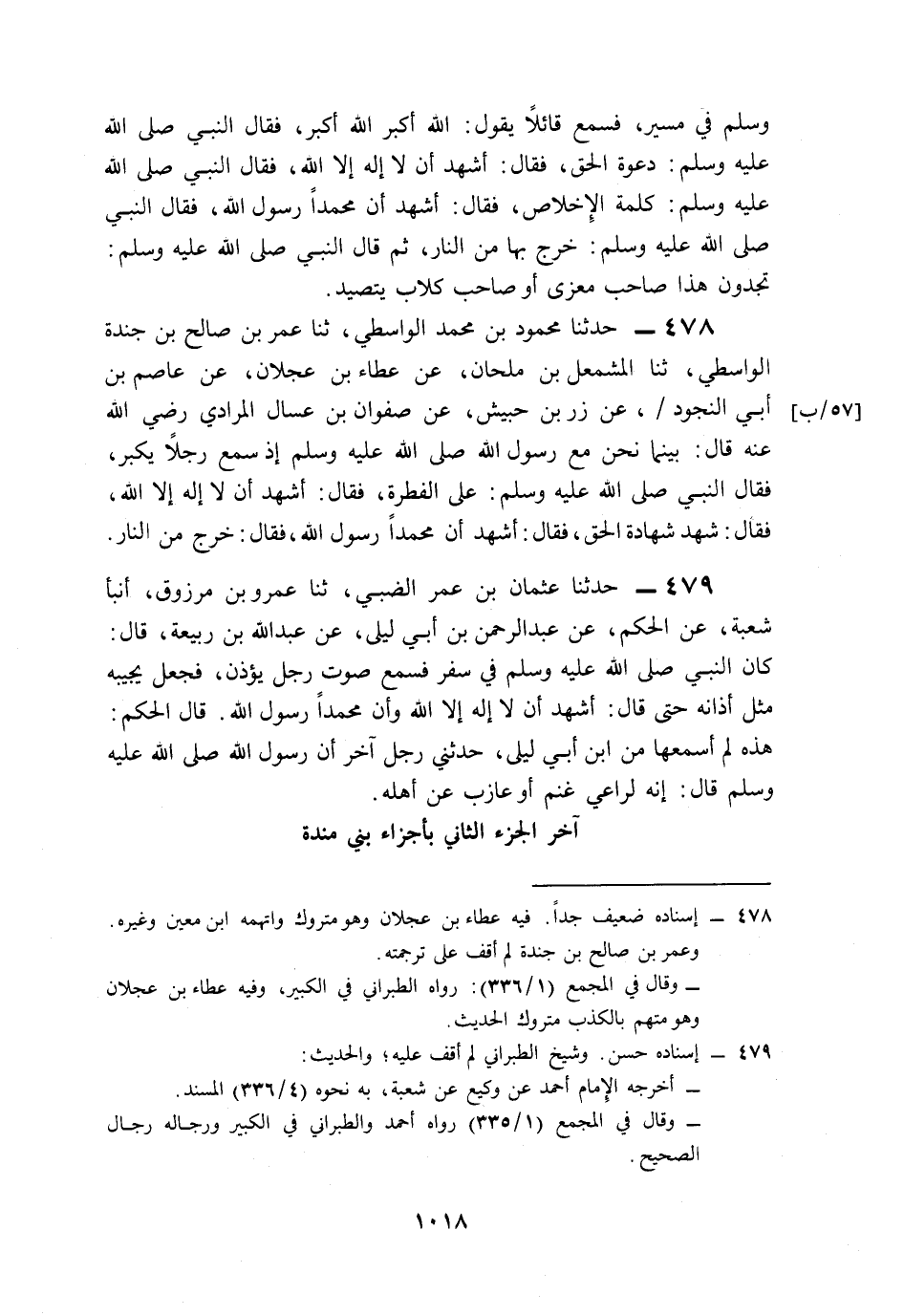 478 - حَدَّثَنَا مَحْمُودُ بْنُ مُحَمَّدٍ الْوَاسِطِيُّ، حَدَّثَنَا عُمَرُ بْنُ صَالِحِ بْنِ جَبِيرَةَ (1) الْوَاسِطِيُّ، حَدَّثَنَا الْمُشْمَعِلُّ بْنُ مِلْحَانَ، عَنْ عَطَاءِ بْنِ عَجْلاَنَ، عَنْ عَاصِمِ بْنِ أَبِي النَّجُودِ، عَنْ زِرِّ بْنِ حُبَيْشٍ، عَنْ صَفْوَانَ بْنِ عَسَّالِ الْمُرَادِيِّ، رَضِيَ اللَّهُ عَنْهُ قَالَ: بَيْنَمَا نَحْنُ مَعَ رَسُولِ اللهِ صَلى الله عَلَيه وَسَلم, إِذْ سَمِعَ رَجُلاً يُكَبِّرُ، فَقَالَ النَّبِيُّ صَلى الله عَلَيه وَسَلم: عَلَى الْفِطْرَةِ, فَقَالَ: أَشْهَدُ أَنْ لاَ إِلَهَ إِلاَّ اللَّهُ، فَقَالَ: شَهِدَ شَهَادَةَ الْحَقِّ, فَقَالَ: أَشْهَدُ أَنَّ مُحَمَّدًا رَسُولُ اللهِ، فَقَالَ: خَرَجَ مِنَ النَّارِ.