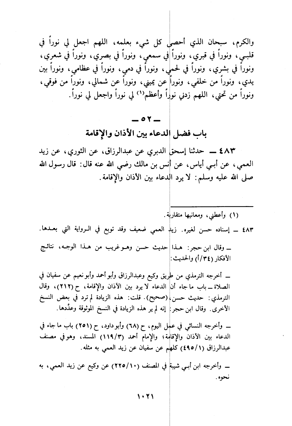 483- حَدَّثَنَا إِسْحَاقُ الدَّبَرِيُّ، عَنْ عَبْدِ الرَّزَّاقِ، عَنِ الثَّوْرِيِّ، عَنْ زَيْدٍ الْعَمِّيُّ، عَنْ أَبِي إِيَاسَ، عَنْ أَنَسِ بْنِ مَالِكٍ، رَضِيَ اللَّهُ عَنْهُ قَالَ: قَالَ رَسُولُ اللهِ صَلى الله عَلَيه وَسَلم: لاَ يُرَدُّ الدُّعَاءُ بَيْنَ الأَذَانَ وَالإِقَامَةِ.