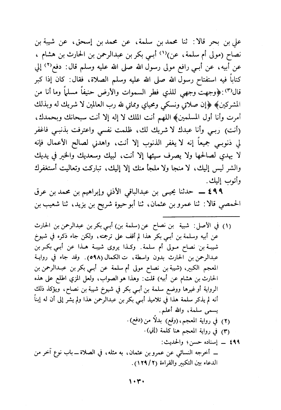 499- حَدَّثَنَا يَحْيَى بْنُ عَبْدِ الْبَاقِي الأَذَنِيُّ، وَإِبْرَاهِيمُ بْنُ مُحَمَّدِ بْنِ عِرْقٍ الْحِمْصِيُّ، قَالاَ: حَدَّثَنَا عَمْرُو بْنُ عُثْمَانَ، حَدَّثَنَا أَبُو حَيْوَةَ شُرَيْحُ بْنُ يَزِيدَ، حَدَّثَنَا شُعَيْبُ بْنُ أَبِي حَمْزَةَ، عَنْ مُحَمَّدِ بْنِ الْمُنْكَدِرِ، عَنْ جَابِرٍ، رَضِيَ اللَّهُ عَنْهُ قَالَ: كَانَ رَسُولُ اللهِ صَلى الله عَلَيه وَسَلم إِذَا اسْتَفْتَحَ الصَّلاَةَ كَبَّرَ, ثُمَّ قَالَ: {إِنَّ صَلاَتِي وَنُسُكِي وَمَحْيَايَ وَمَمَاتِي لِلَّهِ رَبِّ الْعَالَمِينَ لاَ شَرِيكَ لَهُ وَبِذَلِكَ أُمِرْتُ وَأَنَا أَوَّلُ الْمُسْلِمِينَ}، اللَّهُمَّ اهْدِنِي لِأَحْسَنِ الأَعْمَالِ, وَلِأَحْسَنِ الأَخْلاَقِ، وَلاَ يَهْدِي لِأَحْسَنِهَا إِلاَّ أَنْتَ، وَقِنِي شَرَّ الأَعْمَالِ, وَشَرَّ الأَخْلاَقِ, فَإِنَّهُ لاَ يَقِي سَيِّئَهَا إِلاَّ أَنْتَ.