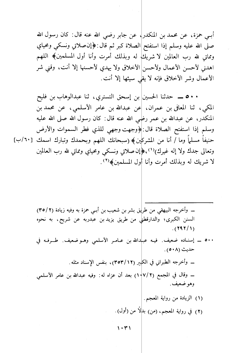 500- حَدَّثَنَا الْحُسَيْنُ بْنُ إِسْحَاقَ التُّسْتَرِيُّ، حَدَّثَنَا عَبْدُ الْوَهَّابِ بْنُ فُلَيْحٍ الْمَكِّيُّ، حَدَّثَنَا الْمُعَافَى بْنُ عِمْرَانَ، عَنْ عَبْدِ اللهِ بْنِ عَامِرٍ الأَسْلَمِيِّ، عَنْ مُحَمَّدِ بْنِ الْمُنْكَدِرِ، عَنْ عَبْدِ اللهِ بْنِ عُمَرَ، رَضِيَ اللَّهُ عَنْهُ قَالَ: كَانَ رَسُولُ اللهِ صَلى الله عَلَيه وَسَلم إِذَا اسْتَفْتَحَ الصَّلاَةَ قَالَ: وَجَّهْتُ وَجْهِيَ لِلَّذِي فَطَرَ السَّمَاوَاتِ وَالأَرْضَ حَنِيفًا مُسْلِمًا وَمَا أَنَا مِنَ الْمُشْرِكِينَ، (سُبْحَانَكَ اللَّهُمَّ وَبِحَمْدِكَ، وَتَبَارَكَ اسْمُكَ، وَتَعَالَى جَدُّكَ، وَلاَ إِلَهَ غَيْرُكَ)، {إِنَّ صَلاَتِي وَنُسُكِي وَمَحْيَايَ وَمَمَاتِي لِلَّهِ رَبِّ الْعَالَمِينَ لاَ شَرِيكَ لَهُ وَبِذَلِكَ أُمِرْتُ وَأَنَا أَوَّلُ الْمُسْلِمِينَ}.
