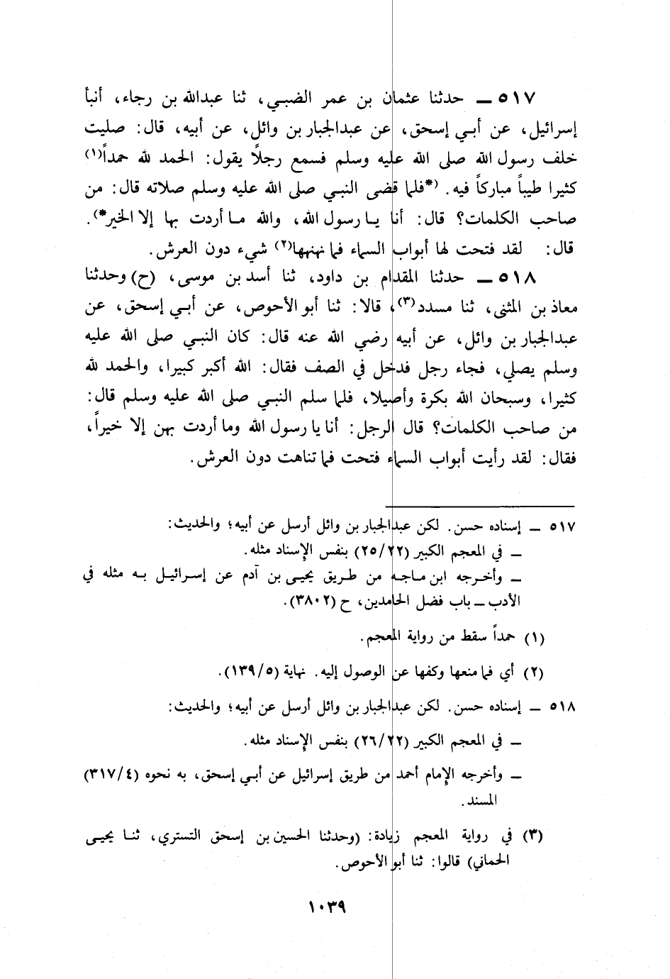 517- حَدَّثَنَا عُثْمَانُ بْنُ عُمَرَ الضَّبِّيُّ، حَدَّثَنَا عَبْدُ اللهِ بْنُ رَجَاءٍ، أَخْبَرَنَا إِسْرَائِيلُ، عَنْ أَبِي إِسْحَاقَ، عَنْ عَبْدِ الْجَبَّارِ بْنِ وَائِلٍ، عَنْ أَبِيهِ، قَالَ: صَلَّيْتُ خَلْفَ رَسُولِ اللهِ صَلى الله عَلَيه وَسَلم, فَسَمِعَ رَجُلاً يَقُولُ: الْحَمْدُ لِلَّهِ حَمْدًا كَثِيرًا طَيِّبًا مُبَارَكًا فِيهِ، فَلَمَّا قَضَى النَّبِيُّ صَلى الله عَلَيه وَسَلم صَلاَتَهُ قَالَ: مَنْ صَاحِبُ الْكَلِمَاتِ؟ قَالَ: أَنَا يَا رَسُولَ اللهِ، وَاللهِ مَا أَرَدْتُ بِهَا إِلاَّ الْخَيْرَ، قَالَ: لَقَدْ فُتِحَتْ لَهَا أَبْوَابُ السَّمَاءِ, فَمَا نَهْنَهَهَا شَيْءٌ دُونَ الْعَرْشِ.