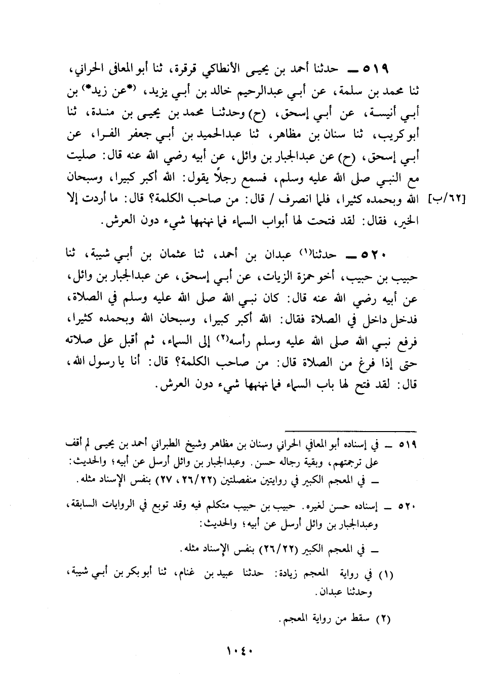 519- حَدَّثَنَا أَحْمَدُ بْنُ يَحْيَى الأَنْطَاكِيُّ، قَرْقَرَةُ، حَدَّثَنَا أَبُو الْمُعَافَى الْحَرَّانِيُّ، حَدَّثَنَا مُحَمَّدُ بْنُ سَلَمَةَ، عَنْ أَبِي عَبْدِ الرَّحِيمِ خَالِدِ بْنِ أَبِي يَزِيدَ، عَنْ زَيْدِ بْنِ أَبِي أُنَيْسَةَ، عَنْ أَبِي إِسْحَاقَ (ح) وَحَدَّثَنَا مُحَمَّدُ بْنُ يَحْيَى بْنِ مَنْدَةَ، حَدَّثَنَا أَبُو كُرَيْبٍ، حَدَّثَنَا سِنَانُ بْنُ مُظَاهِرٍ، حَدَّثَنَا عَبْدُ الْحَمِيدِ بْنُ أَبِي جَعْفَرٍ الْفَرَّا، عَنْ أَبِي إِسْحَاقَ (ح) عَنْ عَبْدِ الْجَبَّارِ بْنِ وَائِلٍ، عَنْ أَبِيهِ، رَضِيَ اللَّهُ عَنْهُ قَالَ: صَلَّيْتُ مَعَ النَّبِيِّ صَلى الله عَلَيه وَسَلم, فَسَمِعَ رَجُلاً يَقُولُ: اللَّهُ أَكْبَرُ كَبِيرًا، وَسُبْحَانَ اللهِ وَبِحَمْدِهِ كَثِيرًا، فَلَمَّا انْصَرَفَ قَالَ: مَنْ صَاحِبُ الْكَلِمَةِ؟ قَالَ: مَا أَرَدْتُ إِلاَّ الْخَيْرَ، فَقَالَ: لَقَدْ فُتِحَتْ لَهَا أَبْوَابُ السَّمَاءِ، فَمَا نَهْنَهَهَا شَيْءٌ دُونَ الْعَرْشِ.