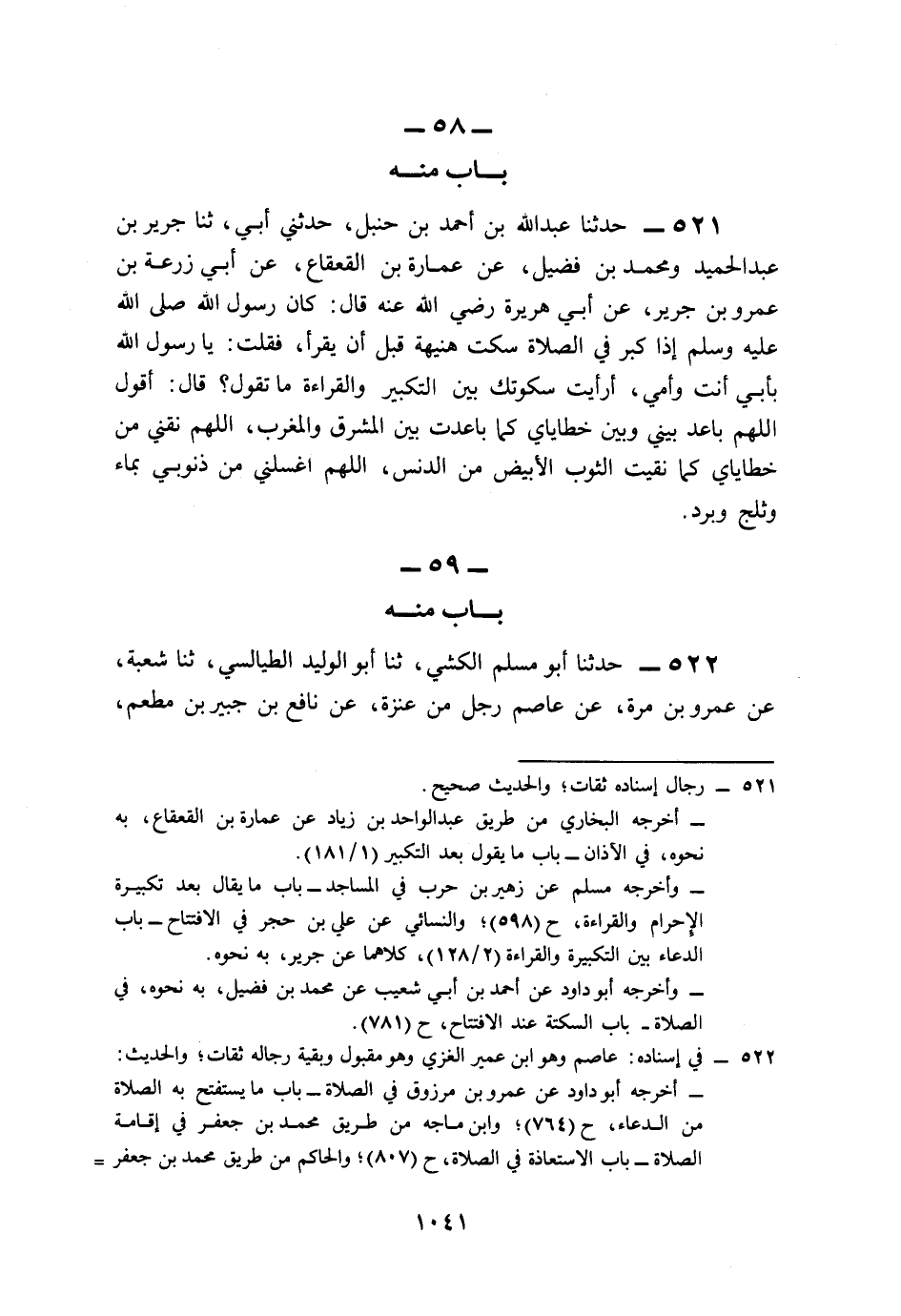 521- حَدَّثَنَا عَبْدُ اللهِ بْنُ أَحْمَدَ بْنِ حَنْبَلٍ، حَدَّثَنِي أَبِي، حَدَّثَنَا جَرِيرُ بْنُ عَبْدِ الْحَمِيدِ، وَمُحَمَّدُ بْنُ فُضَيْلٍ، عَنْ عُمَارَةَ بْنِ الْقَعْقَاعِ، عَنْ أَبِي زُرْعَةَ بْنِ عَمْرِو بْنِ جَرِيرٍ، عَنْ أَبِي هُرَيْرَةَ، رَضِيَ اللَّهُ عَنْهُ قَالَ: كَانَ رَسُولُ اللهِ صَلى الله عَلَيه وَسَلم إِذَا كَبَّرَ فِي الصَّلاَةِ سَكَتَ هُنَيْهَةً قَبْلَ أَنْ يَقْرَأَ، فَقُلْتُ: يَا رَسُولَ اللهِ, بِأَبِي أَنْتَ وَأُمِّي, أَرَأَيْتَ سُكُوتَكَ بَيْنَ التَّكْبِيرِ وَالْقِرَاءَةِ, مَا تَقُولُ؟ قَالَ: أَقُولُ: اللَّهُمَّ بَاعِدْ بَيْنِي وَبَيْنَ خَطَايَايَ كَمَا بَاعَدْتَ بَيْنَ الْمَشْرِقِ وَالْمَغْرِبِ، اللَّهُمَّ نَقِّنِي مِنْ خَطَايَايَ كَمَا نَقَّيْتَ الثَّوْبَ الأَبْيَضَ مِنَ الدَّنَسِ، اللَّهُمَّ اغْسِلْنِي مِنْ ذُنُوبِي بِمَاءٍ وَثَلْجٍ وَبَرَدٍ.