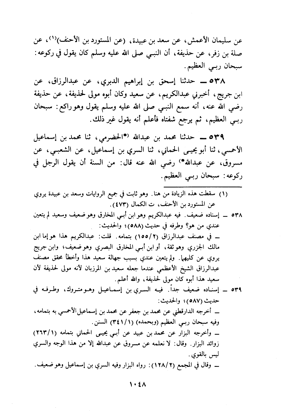 539- حَدَّثَنَا مُحَمَّدُ بْنُ عَبْدِ اللهِ الْحَضْرَمِيُّ، حَدَّثَنَا مُحَمَّدُ بْنُ إِسْمَاعِيلَ الأَحْمَسِيُّ، حَدَّثَنَا أَبُو يَحْيَى الْحِمَّانِيُّ، حَدَّثَنَا السَّرِيُّ بْنُ إِسْمَاعِيلَ، عَنِ الشَّعْبِيِّ، عَنْ مَسْرُوقٍ، عَنْ عَبْدِ اللهِ، رَضِيَ اللَّهُ عَنْهُ قَالَ: مِنَ السُّنَّةِ أَنْ يَقُولَ الرَّجُلُ فِي رُكُوعِهِ: سُبْحَانَ رَبِّيَ الْعَظِيمِ.