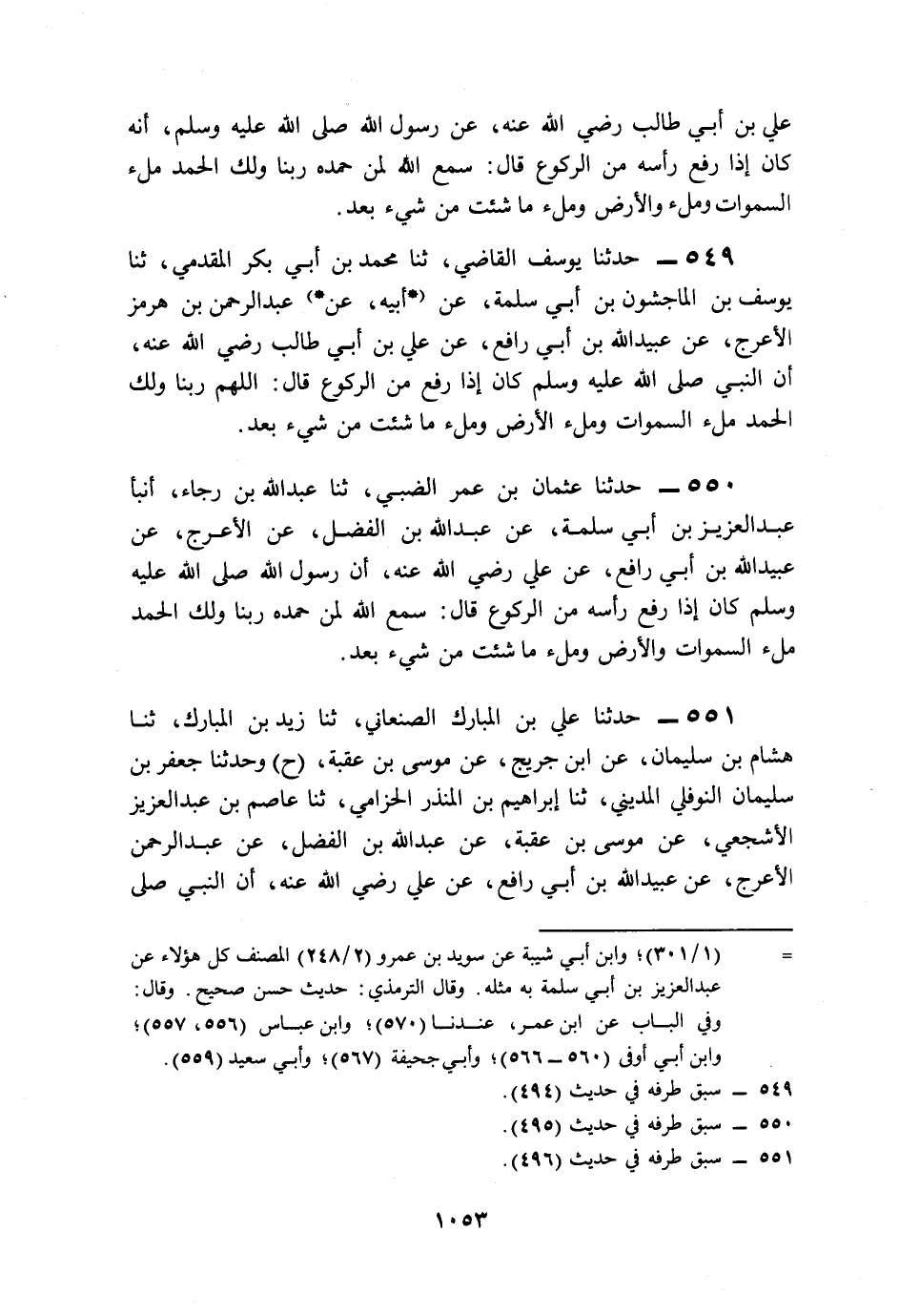 551- حَدَّثَنَا عَلِيُّ بْنُ الْمُبَارَكِ الصَّنْعَانِيُّ، حَدَّثَنَا زَيْدُ بْنُ الْمُبَارَكِ، حَدَّثَنَا هِشَامُ بْنُ سُلَيْمَانَ، عَنِ ابْنِ جُرَيْجٍ، عَنْ مُوسَى بْنِ عُقْبَةَ (ح) وَحَدَّثَنَا جَعْفَرُ بْنُ سُلَيْمَانَ النَّوْفَلِيُّ الْمَدِينِيُّ، حَدَّثَنَا إِبْرَاهِيمُ بْنُ الْمُنْذِرِ الْحِزَامِيُّ، حَدَّثَنَا عَاصِمُ بْنُ عَبْدِ الْعَزِيزِ الأَشْجَعِيُّ، عَنْ مُوسَى بْنِ عُقْبَةَ، عَنْ عَبْدِ اللهِ بْنِ الْفَضْلِ، عَنْ عَبْدِ الرَّحْمَنِ الأَعْرَجِ، عَنْ عُبَيْدِ اللهِ بْنِ أَبِي رَافِعٍ، عَنْ عَلِيٍّ، رَضِيَ اللَّهُ عَنْهُ, أَنَّ النَّبِيَّ صَلى الله عَلَيه وَسَلم كَانَ إِذَا رَفَعَ رَأْسَهُ مِنَ الرُّكُوعِ قَالَ: سَمِعَ اللَّهُ لِمَنْ حَمِدَهُ، رَبَّنَا وَلَكَ الْحَمْدُ، مِلْءَ السَّمَاوَاتِ وَالأَرْضِ، وَمِلْءَ مَا شِئْتَ مِنْ شَيْءٍ بَعْدُ.