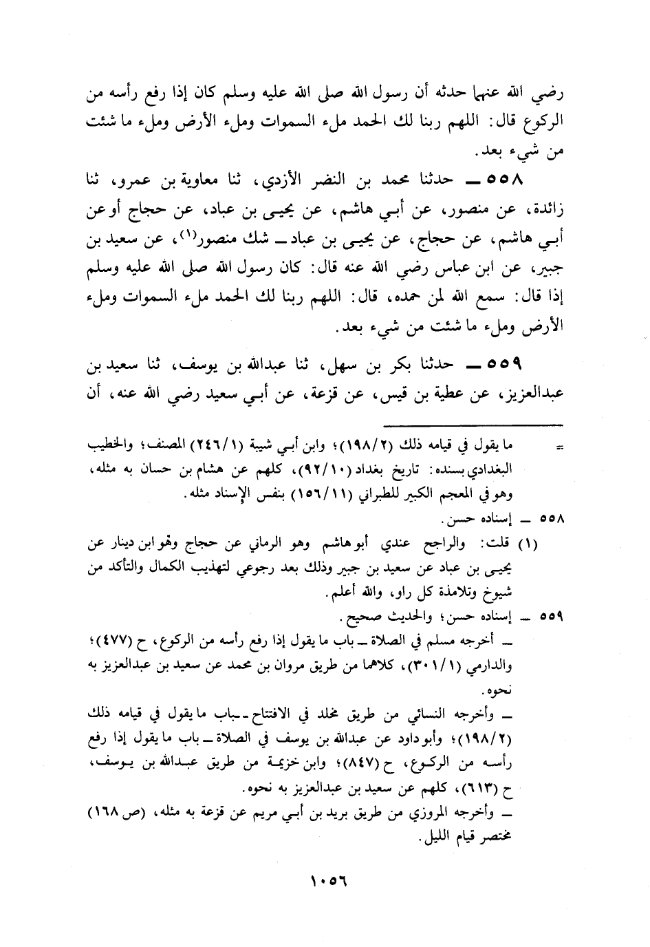 558- حَدَّثَنَا مُحَمَّدُ بْنُ النَّضْرِ الأَزْدِيُّ، حَدَّثَنَا مُعَاوِيَةُ بْنُ عَمْرٍو، حَدَّثَنَا زَائِدَةُ، عَنْ مَنْصُورٍ، عَنْ أَبِي هَاشِمٍ، عَنْ يَحْيَى بْنِ عَبَّادٍ، عَنْ حَجَّاجٍ، أَوْ عَنْ أَبِي هَاشِمٍ، عَنْ حَجَّاجٍ، عَنْ يَحْيَى بْنِ عَبَّادٍ, شَكَّ مَنْصُورٌ, عَنْ سَعِيدِ بْنِ جُبَيْرٍ، عَنِ ابْنِ عَبَّاسٍ، رَضِيَ اللَّهُ عَنْهُ قَالَ: كَانَ رَسُولُ اللهِ صَلى الله عَلَيه وَسَلم إِذَا قَالَ: سَمِعَ اللَّهُ لِمَنْ حَمِدَهُ قَالَ: اللَّهُمَّ رَبَّنَا لَكَ الْحَمْدُ، مِلْءَ السَّمَاوَاتِ وَمِلْءَ الأَرْضِ، وَمِلْءَ مَا شِئْتَ مِنْ شَيْءٍ بَعْدُ.