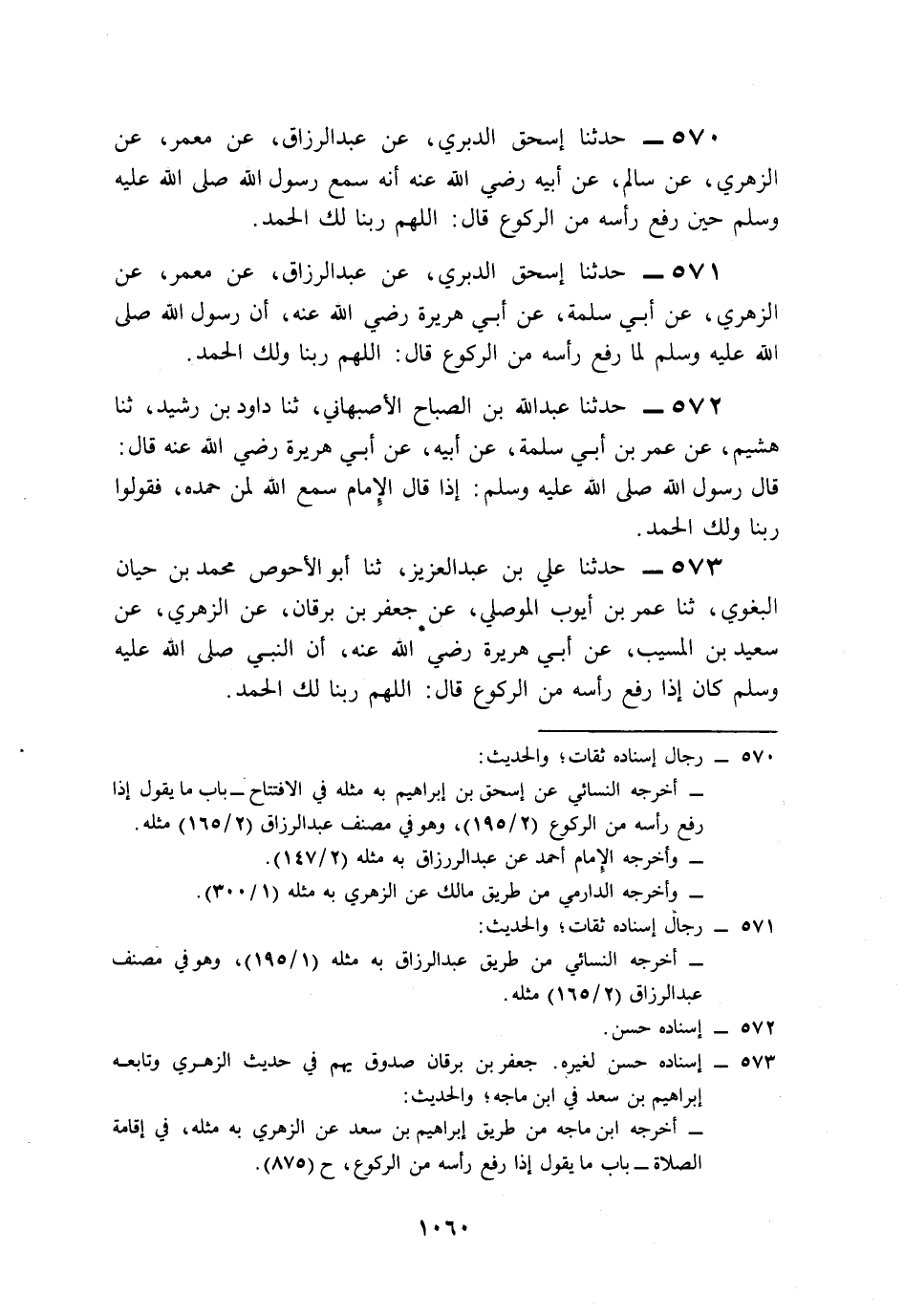 571- حَدَّثَنَا إِسْحَاقُ الدَّبَرِيُّ، عَنْ عَبْدِ الرَّزَّاقِ، عَنْ مَعْمَرٍ، عَنِ الزُّهْرِيِّ، عَنْ أَبِي سَلَمَةَ، عَنْ أَبِي هُرَيْرَةَ، رَضِيَ اللَّهُ عَنْهُ, أَنَّ رَسُولَ اللهِ صَلى الله عَلَيه وَسَلم لَمَّا رَفَعَ رَأْسَهُ مِنَ الرُّكُوعِ قَالَ: اللَّهُمَّ رَبَّنَا وَلَكَ الْحَمْدُ.