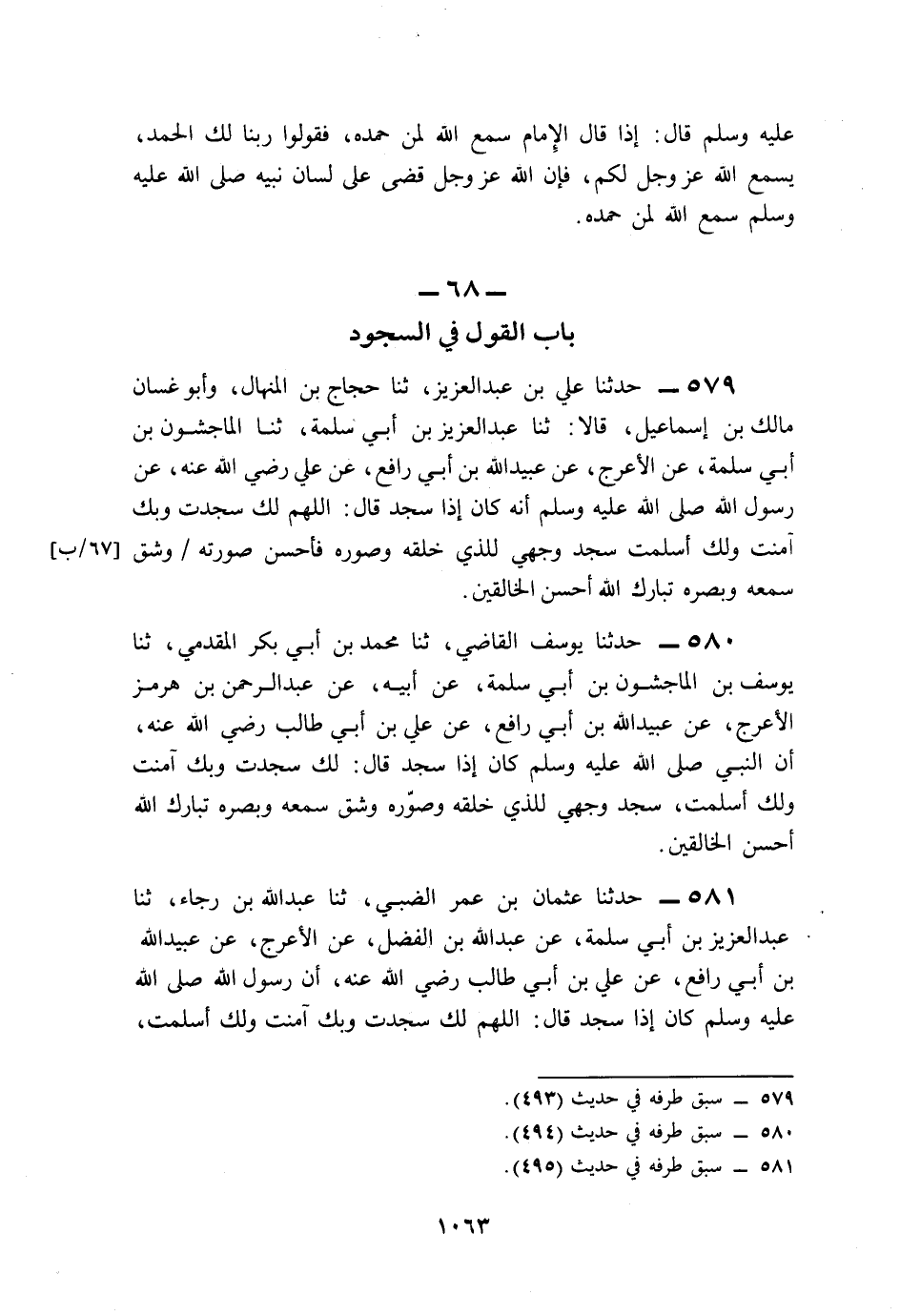 579- حَدَّثَنَا عَلِيُّ بْنُ عَبْدِ الْعَزِيزِ، حَدَّثَنَا حَجَّاجُ بْنُ الْمِنْهَالِ، وَأَبُو غَسَّانَ مَالِكُ بْنُ إِسْمَاعِيلَ, قَالاَ: حَدَّثَنَا عَبْدُ الْعَزِيزِ بْنُ أَبِي سَلَمَةَ، حَدَّثَنَا الْمَاجِشُونُ بْنُ أَبِي سَلَمَةَ، عَنِ الأَعْرَجِ، عَنْ عُبَيْدِ اللهِ بْنِ أَبِي رَافِعٍ، عَنْ عَلِيٍّ، رَضِيَ اللَّهُ عَنْهُ، عَنْ رَسُولِ اللهِ صَلى الله عَلَيه وَسَلم أَنَّهُ كَانَ إِذَا سَجَدَ قَالَ: اللَّهُمَّ لَكَ سَجَدْتُ، وَبِكَ آمَنْتُ، وَلَكَ أَسْلَمْتُ, سَجَدَ وَجْهِي لِلَّذِي خَلَقَهُ وَصَوَّرَهُ, فَأَحْسَنَ صُورَتَهُ، وَشَقَّ سَمْعَهُ وَبَصَرَهُ، تَبَارَكَ اللَّهُ أَحْسَنُ الْخَالِقِينَ.