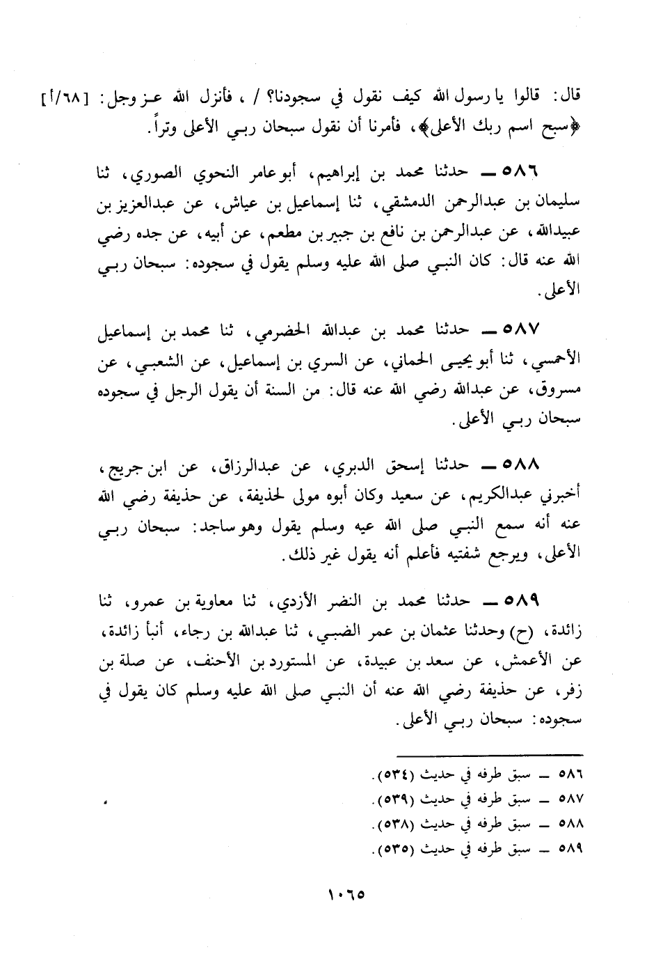 589- حَدَّثَنَا مُحَمَّدُ بْنُ النَّضْرِ الأَزْدِيُّ، حَدَّثَنَا مُعَاوِيَةُ بْنُ عَمْرٍو، حَدَّثَنَا زَائِدَةُ (ح) وَحَدَّثَنَا عُثْمَانُ بْنُ عُمَرَ الضَّبِّيُّ، حَدَّثَنَا عَبْدُ اللهِ بْنُ رَجَاءٍ، أَخْبَرَنَا زَائِدَةُ، عَنِ الأَعْمَشِ، عَنْ سَعْدِ بْنِ عُبَيْدَةَ، عَنِ الْمُسْتَوْرِدِ بْنِ الأَحْنَفِ، عَنْ صِلَةَ بْنِ زُفَرَ، عَنْ حُذَيْفَةَ، رَضِيَ اللَّهُ عَنْهُ, أَنَّ النَّبِيَّ صَلى الله عَلَيه وَسَلم كَانَ يَقُولُ فِي سُجُودِهِ: سُبْحَانَ رَبِّيَ الأَعْلَى.