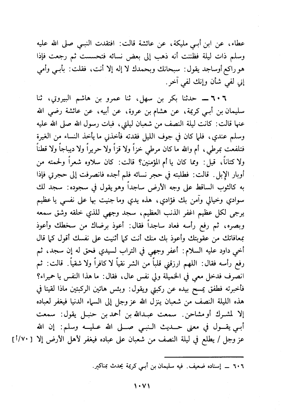 606- حَدَّثَنَا بَكْرُ بْنُ سَهْلٍ، حَدَّثَنَا عَمْرُو بْنُ هَاشِمٍ الْبَيْرُوتِيُّ، حَدَّثَنَا سُلَيْمَانُ بْنُ أَبِي كَرِيمَةَ، عَنْ هِشَامِ بْنِ عُرْوَةَ، عَنْ أَبِيهِ، عَنْ عَائِشَةَ، رَضِيَ اللَّهُ عَنْهَا قَالَتْ: كَانَتْ لَيْلَةُ النِّصْفِ مِنْ شَعْبَانَ لَيْلَتِي، فَبَاتَ رَسُولُ اللهِ صَلى الله عَلَيه وَسَلم عِنْدِي, فَلَمَّا كَانَ فِي جَوْفِ اللَّيْلِ, فَقَدْتَهُ, فَأَخَذَنِي مَا يَأْخُذُ النِّسَاءَ مِنَ الْغَيْرَةِ, فَتَلَفَّعْتُ بِمِرْطِي، أَمَا وَاللهِ مَا كَانَ مِرْطِي خَزًّا, وَلاَ قَزًّا, وَلاَ حَرِيرًا, وَلاَ دِيبَاجًا, وَلاَ قُطْنًا, وَلاَ كَتَّانًا، قِيلَ: وَمِمَّ كَانَ يَا أُمَّ الْمُؤْمِنِينَ؟ قَالَتْ: كَانَ سَلاَوهُ شَعَرًا, وَلُحْمَتُهُ مِنْ أَوْبَارِ الإِبِلِ، قَالَتْ: فَطَلَبْتُهُ فِي حُجَرِ نِسَائِهِ, فَلَمْ أَجِدْهُ، فَانْصَرَفْتُ إِلَى حُجْرَتِي,