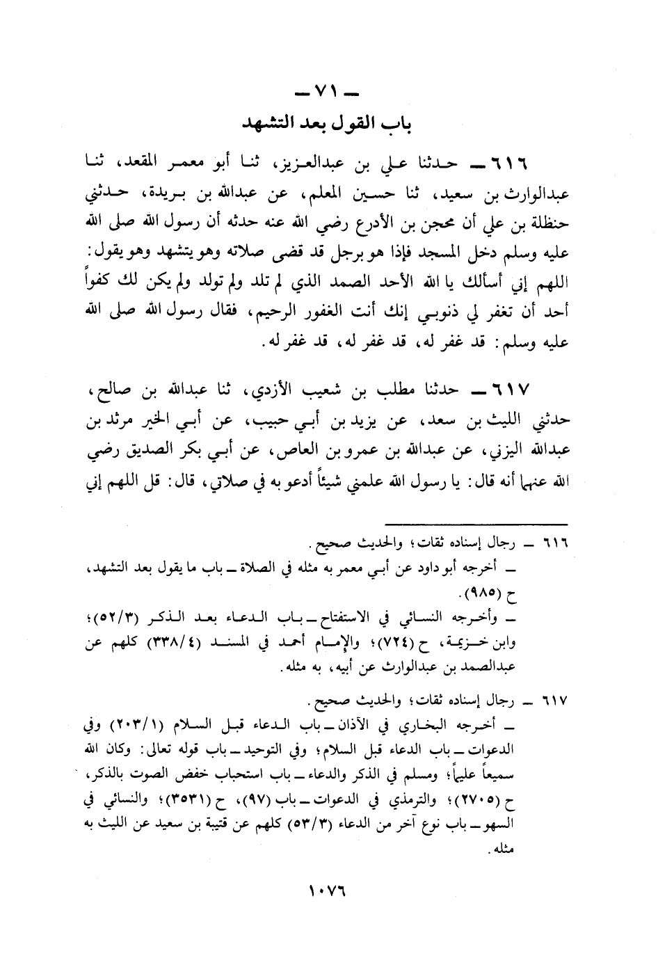 616- حَدَّثَنَا عَلِيُّ بْنُ عَبْدِ الْعَزِيزِ، حَدَّثَنَا أَبُو مَعْمَرٍ الْمُقْعَدُ، حَدَّثَنَا عَبْدُ الْوَارِثِ بْنُ سَعِيدٍ، حَدَّثَنَا حُسَيْنٌ الْمُعَلِّمُ، عَنْ عَبْدِ اللهِ بْنِ بُرَيْدَةَ، حَدَّثَنِي حَنْظَلَةُ بْنُ عَلِيٍّ، أَنَّ مِحْجَنَ بْنَ الأَدْرَعَ، رَضِيَ اللَّهُ عَنْهُ حَدَّثَهُ, أَنَّ رَسُولَ اللهِ صَلى الله عَلَيه وَسَلم دَخَلَ الْمَسْجِدَ, فَإِذَا هُوَ بِرَجُلٍ قَدْ قَضَى صَلاَتَهُ وَهُوَ يَتَشَهَّدُ, وَهُوَ يَقُولُ: اللَّهُمَّ إِنِّي أَسْأَلُكَ يَا اللَّهُ الأَحَدُ الصَّمَدُ, الَّذِي لَمْ تَلِدْ وَلَمْ تُولَدْ, وَلَمْ يَكُنْ لَكَ كُفُوًا أَحَدٌ أَنْ تَغْفِرَ لِي ذُنُوبِي, إِنَّكَ أَنْتَ الْغَفُورُ الرَّحِيمُ، فَقَالَ رَسُولُ اللهِ صَلى الله عَلَيه وَسَلم: قَدْ غُفِرَ لَهُ، قَدْ غُفِرَ لَهُ، قَدْ غُفِرَ لَهُ.