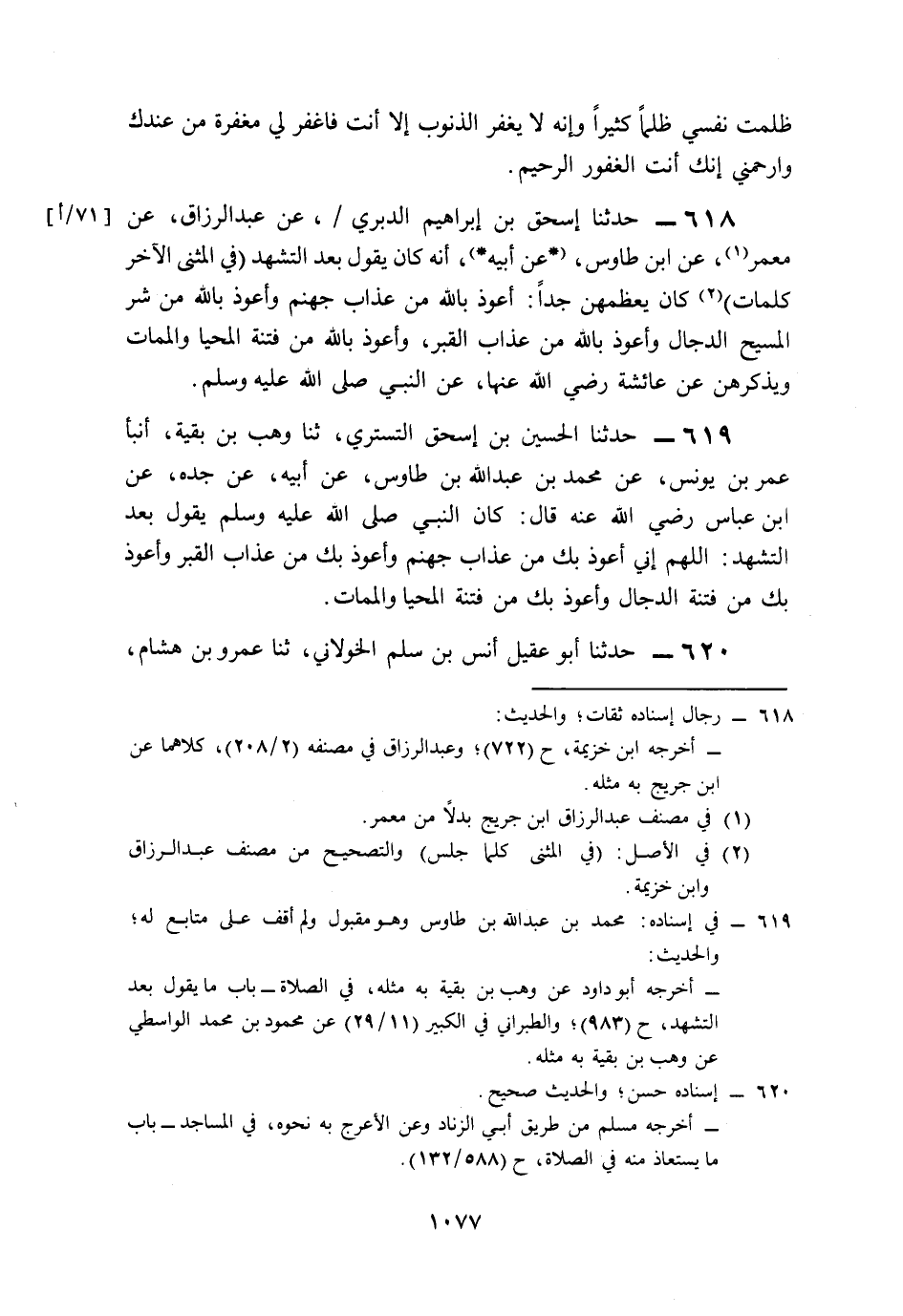 618- حَدَّثَنَا إِسْحَاقُ بْنُ إِبْرَاهِيمَ الدَّبَرِيُّ، عَنْ عَبْدِ الرَّزَّاقِ، عَنْ مَعْمَرٍ، عَنِ ابْنِ طَاوُوسٍ، عَنْ أَبِيهِ، أَنَّهُ كَانَ يَقُولُ بَعْدَ التَّشَهُّدِ فِي المَثْنَى الآخِرِ كَلِمَاتٍ كَانَ يُعَظِّمُهُنَّ جِدًّا: أَعُوذُ بِاللهِ مِنْ عَذَابِ جَهَنَّمَ، وَأَعُوذُ بِاللهِ مِنْ شَرِّ الْمَسِيحِ الدَّجَّالِ، وَأَعُوذُ بِاللهِ مِنْ عَذَابِ الْقَبْرِ، وَأَعُوذُ بِاللهِ مِنْ فِتْنَةِ الْمَحْيَا وَالْمَمَاتِ، وَيَذْكُرُهُنَّ عَنْ عَائِشَةَ رَضِيَ اللَّهُ عَنْهَا, عَنِ النَّبِيِّ صَلى الله عَلَيه وَسَلم.