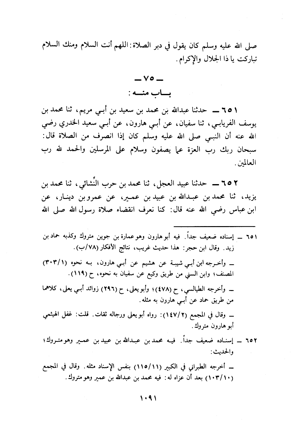 651- حَدَّثَنَا عَبْدُ اللهِ بْنُ مُحَمَّدِ بْنِ سَعِيدِ بْنِ أَبِي مَرْيَمَ، حَدَّثَنَا مُحَمَّدُ بْنُ يُوسُفَ الْفِرْيَابِيُّ، حَدَّثَنَا سُفْيَانُ، عَنْ أَبِي هَارُونَ، عَنْ أَبِي سَعِيدٍ الْخُدْرِيِّ، رَضِيَ اللَّهُ عَنْهُ, أَنَّ النَّبِيَّ صَلى الله عَلَيه وَسَلم كَانَ إِذَا انْصَرَفَ مِنَ الصَّلاَةِ قَالَ: سُبْحَانَ رَبِّكَ رَبِّ الْعِزَّةِ عَمَّا يَصِفُونَ، وَسَلاَمٌ عَلَى الْمُرْسَلِينَ، وَالْحَمْدُ لِلَّهِ رَبِّ الْعَالَمِينَ.