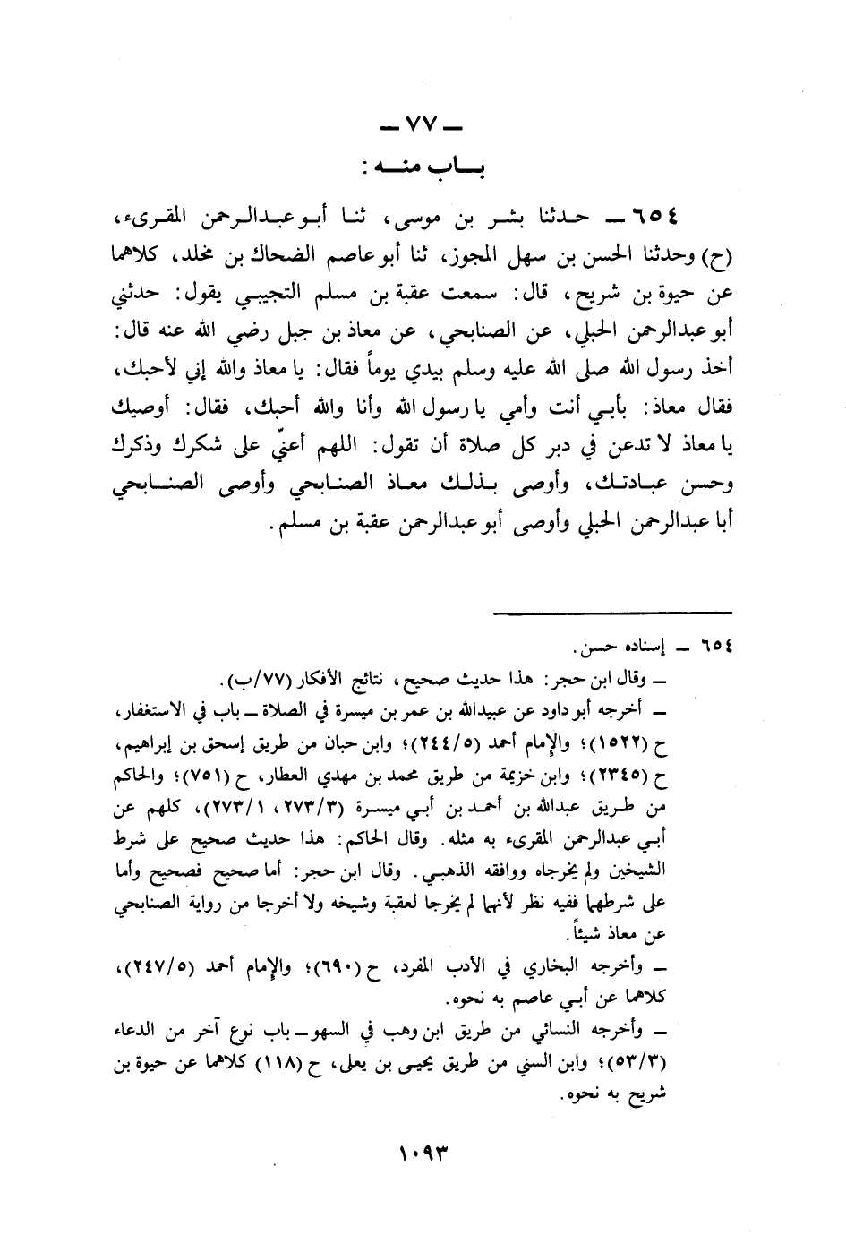 654- حَدَّثَنَا بِشْرُ بْنُ مُوسَى، حَدَّثَنَا أَبُو عَبْدِ الرَّحْمَنِ الْمُقْرِئُ (ح) وَحَدَّثَنَا الْحَسَنُ بْنُ سَهْلٍ الْمُجَوِّزُ، حَدَّثَنَا أَبُو عَاصِمٍ الضَّحَّاكُ بْنُ مَخْلَدٍ، كِلاَهُمَا عَنْ حَيْوَةَ بْنِ شُرَيْحٍ، قَالَ: سَمِعْتُ عُقْبَةَ بْنَ مُسْلِمٍ التُّجِيبِيَّ يَقُولُ: حَدَّثَنِي أَبُو عَبْدِ الرَّحْمَنِ الْحُبُلِيُّ، عَنِ الصُّنَابِحِيّ، عَنْ مُعَاذِ بْنِ جَبَلٍ، رَضِيَ اللَّهُ عَنْهُ قَالَ: أَخَذَ رَسُولُ اللهِ صَلى الله عَلَيه وَسَلم بِيَدِي يَوْمًا, فَقَالَ: يَا مُعَاذُ، وَاللهِ إِنِّي لَأُحِبُّكَ, فَقَالَ مُعَاذٌ: بِأَبِي أَنْتَ وَأُمِّي يَا رَسُولَ اللهِ، وَأَنَا وَاللهِ أُحِبُّكَ، فَقَالَ: أُوصِيكَ يَا مُعَاذُ، لاَ تَدَعَنَّ فِي دُبُرِ كُلِّ صَلاَةٍ أَنْ تَقُولَ: اللَّهُمَّ أَعِنِّي عَلَى شُكْرِكَ وَذِكْرِكَ وَحُسْنِ عِبَادَتِكَ, وَأَوْصَى بِذَلِكَ مُعَاذٌ الصُّنَابِحِيُّ, وَأَوْصَى الصُّنَابِحِيُّ أَبَا عَبْدِ الرَّحْمَنِ الْحُبُلِيَّ, وَأَوْصَى أَبُو عَبْدِ الرَّحْمَنِ عُقْبَةَ بْنَ مُسْلِمٍ.