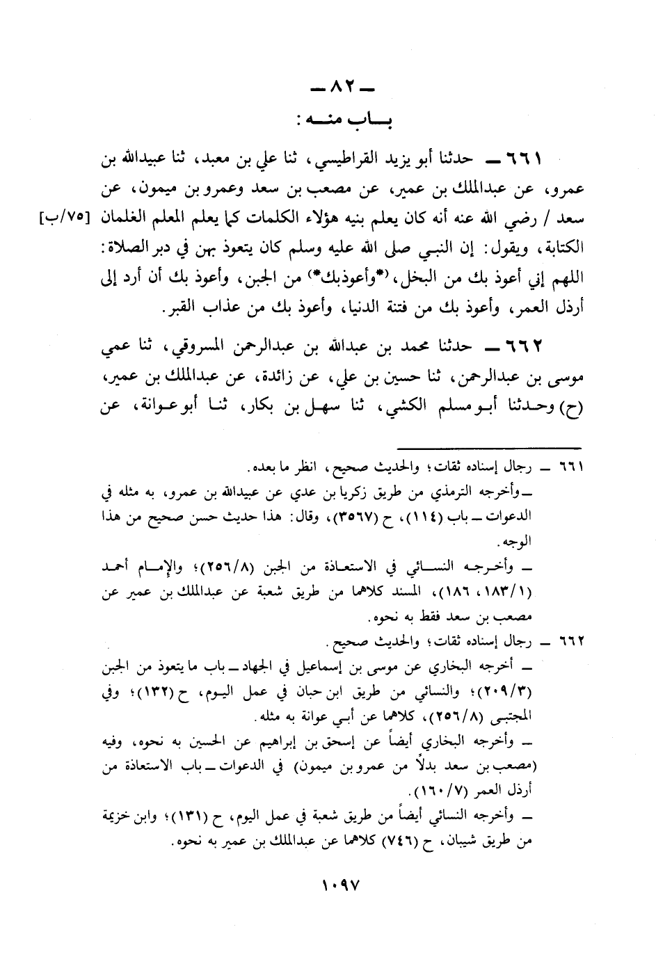 662- حَدَّثَنَا مُحَمَّدُ بْنُ عَبْدِ اللهِ بْنِ عَبْدِ الرَّحْمَنِ الْمَسْرُوقِيُّ، حَدَّثَنَا عَمِّي مُوسَى بْنُ عَبْدِ الرَّحْمَنِ، حَدَّثَنَا حُسَيْنُ بْنُ عَلِيٍّ، عَنْ زَائِدَةَ، عَنْ عَبْدِ الْمَلِكِ بْنِ عُمَيْرٍ (ح) وَحَدَّثَنَا أَبُو مُسْلِمٍ الْكَشِّيُّ، حَدَّثَنَا سَهْلُ بْنُ بَكَّارٍ، حَدَّثَنَا أَبُو عَوَانَةَ، عَنْ عَبْدِ الْمَلِكِ بْنِ عُمَيْرٍ، عَنْ عَمْرِو بْنِ مَيْمُونٍ، قَالَ: كَانَ سَعْدٌ رَضِيَ اللَّهُ عَنْهُ يُعَلِّمُ بَنِيهِ كَمَا يُعَلِّمُ الْمُعَلِّمُ الْغِلْمَانَ الْكِتَابَةَ, وَيَقُولُ: إِنَّ رَسُولَ اللهِ صَلى الله عَلَيه وَسَلم كَانَ يَتَعَوَّذُ بِهِنَّ فِي دُبُرِ صَلاَتِهِ: اللَّهُمَّ إِنِّي أَعُوذُ بِكَ مِنَ الْعَجْزِ، وَأَعُوذُ بِكَ مِنَ الْجُبْنِ، وَأَعُوذُ بِكَ مِنْ أَنْ أُرَدَّ إِلَى أَرْذَلِ الْعُمُرِ، وَأَعُوذُ بِكَ مِنْ فِتْنَةِ الدُّنْيَا، وَأَعُوذُ بِكَ مِنْ عَذَابِ الْقَبْرِ, فَحَدَّثْتُ بِهَا مُصْعَبًا, فَصَدَّقَهُ.