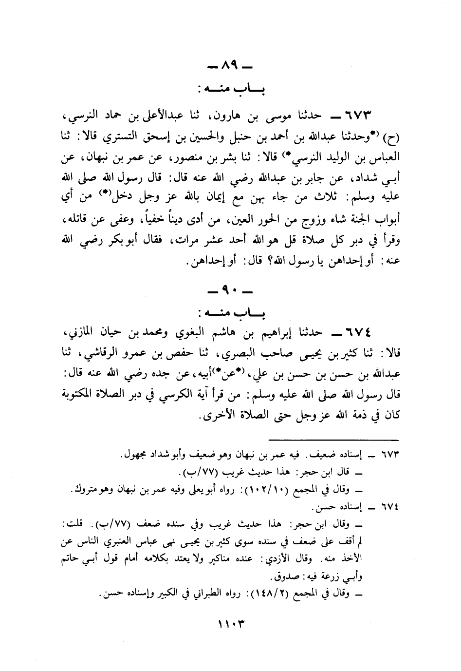 673- حَدَّثَنَا مُوسَى بْنُ هَارُونَ، حَدَّثَنَا عَبْدُ الأَعْلَى بْنُ حَمَّادٍ النَّرْسِيُّ (ح) وَحَدَّثَنَا عَبْدُ اللهِ بْنُ أَحْمَدَ بْنِ حَنْبَلٍ، وَالْحُسَيْنُ بْنُ إِسْحَاقَ التُّسْتَرِيُّ، قَالاَ: حَدَّثَنَا الْعَبَّاسُ بْنُ الْوَلِيدِ النَّرْسِيُّ، قَالاَ: حَدَّثَنَا بِشْرُ بْنُ مَنْصُورٍ، عَنْ عُمَرَ بْنِ نَبْهَانَ، عَنْ أَبِي شَدَّادٍ، عَنْ جَابِرِ بْنِ عَبْدِ اللهِ، رَضِيَ اللَّهُ عَنْهُ قَالَ: قَالَ رَسُولُ اللهِ صَلى الله عَلَيه وَسَلم: ثَلاَثٌ مَنْ جَاءَ بِهِنَّ مَعَ إِيمَانٍ بِاللهِ عَزَّ وَجَلَّ دَخَلَ مِنْ أَيِّ أَبْوَابِ الْجَنَّةِ شَاءَ, وَزُوِّجَ مِنَ الْحُورِ الْعِينِ: مَنْ أَدَّى دَيْنًا خَفِيًّا، وَعَفَى عَنْ قَاتِلِهِ، وَقَرَأَ فِي دُبُرِ كُلِّ صَلاَةٍ: {قُلْ هُوَ اللَّهُ أَحَدٌ} عَشْرَ مَرَّاتٍ, فَقَالَ أَبُو بَكْرٍ رَضِيَ اللَّهُ عَنْهُ: أَوْ إِحْدَاهُنَّ يَا رَسُولَ اللهِ؟ قَالَ: أَوْ إِحْدَاهُنَّ.