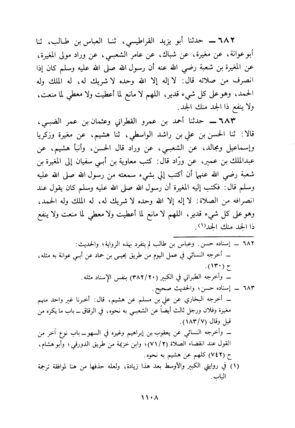 683- حَدَّثَنَا أَحْمَدُ بْنُ عَمْرٍو الْقَطِرَانِيُّ، وَعُثْمَانُ بْنُ عُمَرَ الضَّبِّيُّ، قَالاَ: حَدَّثَنَا الْحَسَنُ بْنُ عَلِيِّ بْنِ رَاشِدٍ الْوَاسِطِيُّ، حَدَّثَنَا هُشَيْمٌ، عَنْ مُغِيرَةَ، وَزَكَرِيَّا، وَإِسْمَاعِيلَ، وَمُجَالِدٍ، عَنِ الشَّعْبِيِّ، عَنْ وَرَّادٍ، قَالَ الْحَسَنُ: وأَخبرنا هُشَيْمٌ، عَنْ عَبْدِ الْمَلِكِ بْنِ عُمَيْرٍ، عَنْ وَرَّادٍ، قَالَ: كَتَبَ مُعَاوِيَةُ بْنُ أَبِي سُفْيَانَ إِلَى الْمُغِيرَةِ بْنِ شُعْبَةَ رَضِيَ اللَّهُ عَنْهُمَا أَنِ اكْتُبْ إِلَيَّ بِشَيْءٍ سَمِعْتَهُ مِنْ رَسُولِ اللهِ صَلى الله عَلَيه وَسَلم، قَالَ: فَكَتَبَ إِلَيْهِ الْمُغِيرَةُ: أَنَّ رَسُولَ اللهِ صَلى الله عَلَيه وَسَلم كَانَ يَقُولُ عِنْدَ انْصِرَافِهِ مِنَ الصَّلاَةِ: لاَ إِلَهَ إِلاَّ اللَّهُ وَحْدَهُ لاَ شَرِيكَ لَهُ، لَهُ الْمُلْكُ، وَلَهُ الْحَمْدُ، وَهُوَ عَلَى كُلِّ شَيْءٍ قَدِيرٌ، اللَّهُمَّ لاَ مَانِعَ لِمَا أَعْطَيْتَ، وَلاَ مُعْطِيَ لِمَا مَنَعْتَ، وَلاَ يَنْفَعُ ذَا الْجَدِّ مِنْكَ الْجَدُّ.