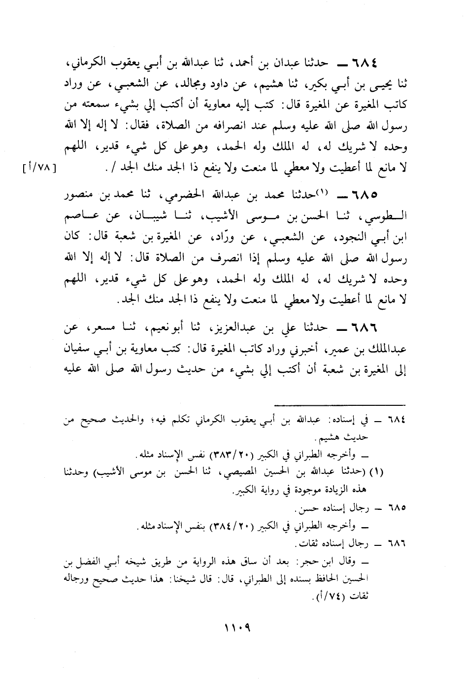 685- حَدَّثَنَا مُحَمَّدُ بْنُ عَبْدِ اللهِ الْحَضْرَمِيُّ، حَدَّثَنَا مُحَمَّدُ بْنُ مَنْصُورٍ الطُّوسِيُّ، حَدَّثَنَا الْحَسَنُ بْنُ مُوسَى الأَشْيَبُ، حَدَّثَنَا شَيْبَانُ، عَنْ عَاصِمِ بْنِ أَبِي النَّجُودِ، عَنِ الشَّعْبِيِّ، عَنْ وَرَّادٍ، عَنِ الْمُغِيرَةِ بْنِ شُعْبَةَ، قَالَ: كَانَ رَسُولُ اللهِ صَلى الله عَلَيه وَسَلم إِذَا انْصَرَفَ مِنَ الصَّلاَةِ قَالَ: لاَ إِلَهَ إِلاَّ اللَّهُ وَحْدَهُ لاَ شَرِيكَ لَهُ، لَهُ الْمُلْكُ وَلَهُ الْحَمْدُ وَهُوَ عَلَى كُلِّ شَيْءٍ قَدِيرٌ، اللَّهُمَّ لاَ مَانِعَ لِمَا أَعْطَيْتَ، وَلاَ مُعْطِيَ لِمَا مَنَعْتَ، وَلاَ يَنْفَعُ ذَا الْجَدِّ مِنْكَ الْجَدُّ.