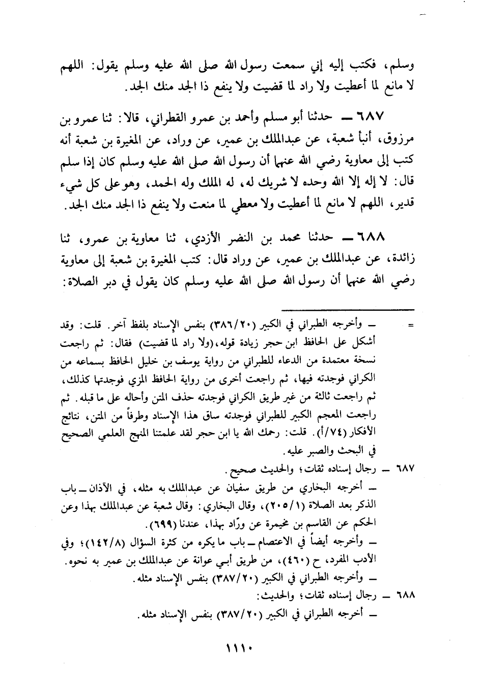 688- حَدَّثَنَا مُحَمَّدُ بْنُ النَّضْرِ الأَزْدِيُّ، حَدَّثَنَا مُعَاوِيَةُ بْنُ عَمْرٍو، حَدَّثَنَا زَائِدَةُ، عَنْ عَبْدِ الْمَلِكِ بْنِ عُمَيْرٍ، عَنْ وَرَّادٍ، قَالَ: كَتَبَ الْمُغِيرَةُ بْنُ شُعْبَةَ إِلَى مُعَاوِيَةَ رَضِيَ اللَّهُ عَنْهُمَا, أَنَّ رَسُولَ اللهِ صَلى الله عَلَيه وَسَلم كَانَ يَقُولُ فِي دُبُرِ الصَّلاَةِ: لاَ إِلَهَ إِلاَّ اللَّهُ وَحْدَهُ لاَ شَرِيكَ لَهُ، لَهُ الْمُلْكُ وَلَهُ الْحَمْدُ، وَهُوَ عَلَى كُلِّ شَيْءٍ قَدِيرٌ، اللَّهُمَّ لاَ مَانِعَ لِمَا أَعْطَيْتَ، وَلاَ مُعْطِيَ لِمَا مَنَعْتَ، وَلاَ يَنْفَعُ ذَا الْجَدِّ مِنْكَ الْجَدُّ.