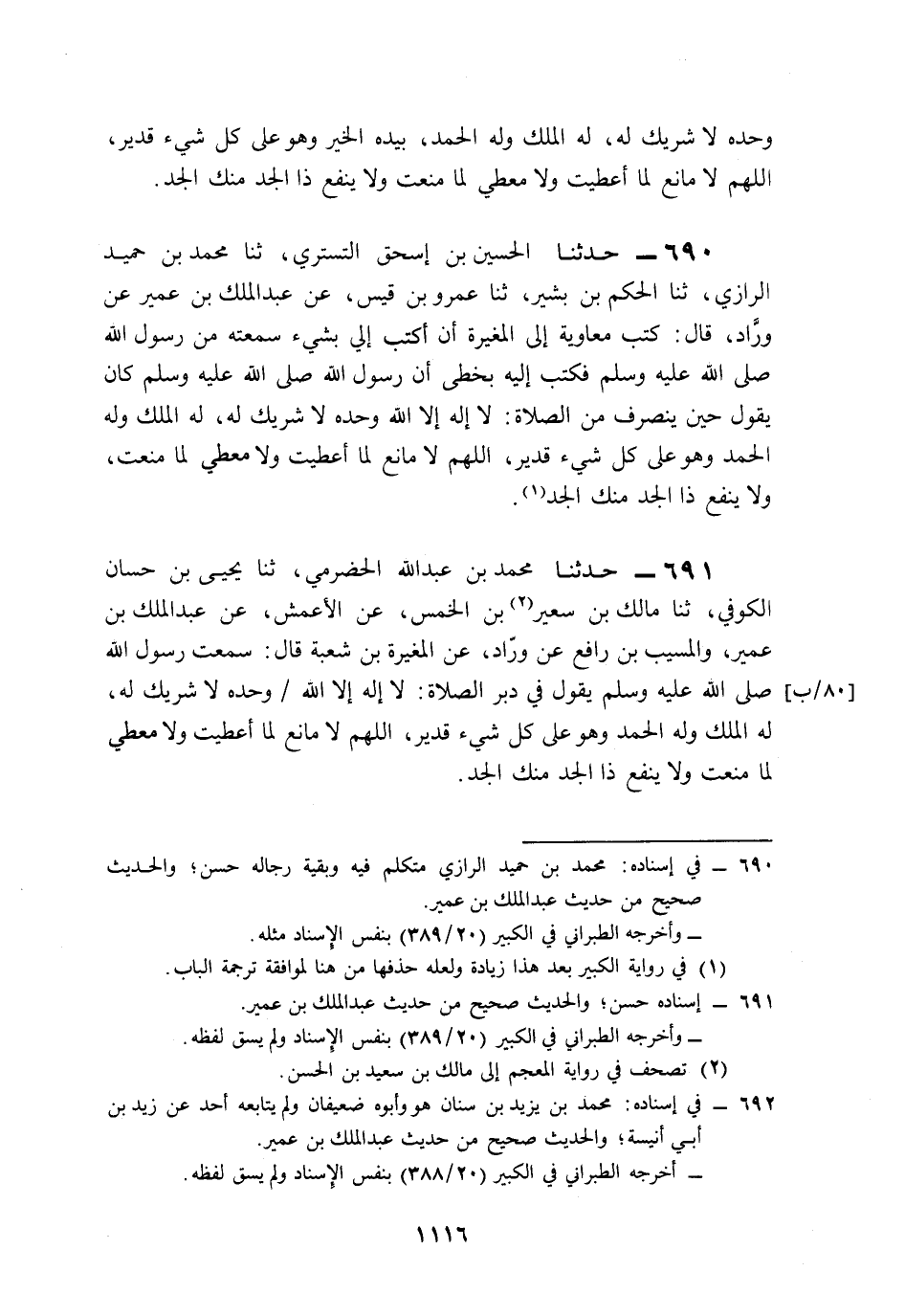 690- حَدَّثَنَا الْحُسَيْنُ بْنُ إِسْحَاقَ التُّسْتَرِيُّ، حَدَّثَنَا مُحَمَّدُ بْنُ حُمَيْدٍ الرَّازِيُّ، حَدَّثَنَا الْحَكَمُ بْنُ بَشِيرٍ، حَدَّثَنَا عَمْرُو بْنُ قَيْسٍ، عَنْ عَبْدِ الْمَلِكِ بْنِ عُمَيْرٍ، عَنْ وَرَّادٍ، قَالَ: كَتَبَ مُعَاوِيَةُ إِلَى الْمُغِيرَةِ أَنِ اكْتُبْ إِلَيَّ بِشَيْءٍ سَمِعْتَهُ مِنْ رَسُولِ اللهِ صَلى الله عَلَيه وَسَلم، فَكَتَبَ إِلَيْهِ بِخَطِّي, أَنَّ رَسُولَ اللهِ صَلى الله عَلَيه وَسَلم كَانَ يَقُولُ حِينَ يَنْصَرِفُ مِنَ الصَّلاَةِ: لاَ إِلَهَ إِلاَّ اللَّهُ وَحْدَهُ لاَ شَرِيكَ لَهُ، لَهُ الْمُلْكُ وَلَهُ الْحَمْدُ وَهُوَ عَلَى كُلِّ شَيْءٍ قَدِيرٌ، اللَّهُمَّ لاَ مَانِعَ لِمَا أَعْطَيْتَ، وَلاَ مُعْطِيَ لِمَا مَنَعْتَ، وَلاَ يَنْفَعُ ذَا الْجَدِّ مِنْكَ الْجَدُّ.