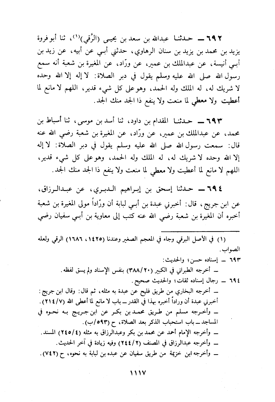 692- حَدَّثَنَا عَبْدُ اللهِ بْنُ سَعْدِ بْنِ يَحْيَى الرَّقِّيُّ، حَدَّثَنَا أَبُو فَرْوَةَ يَزِيدُ بْنُ مُحَمَّدِ بْنِ يَزِيدَ بْنِ سِنَانٍ الرَّهَاوِيُّ، حَدَّثَنِي أَبِي، عَنْ أَبِيهِ، عَنْ زَيْدِ بْنِ أَبِي أُنَيْسَةَ، عَنْ عَبْدِ الْمَلِكِ بْنِ عُمَيْرٍ، عَنْ وَرَّادٍ، عَنِ الْمُغِيرَةِ بْنِ شُعْبَةَ، أَنَّهُ سَمِعَ رَسُولَ اللهِ صَلى الله عَلَيه وَسَلم يَقُولُ فِي دُبُرِ الصَّلاَةِ: لاَ إِلَهَ إِلاَّ اللَّهُ وَحْدَهُ لاَ شَرِيكَ لَهُ، لَهُ الْمُلْكُ وَلَهُ الْحَمْدُ وَهُوَ عَلَى كُلِّ شَيْءٍ قَدِيرٌ، اللَّهُمَّ لاَ مَانِعَ لِمَا أَعْطَيْتَ، وَلاَ مُعْطِيَ لِمَا مَنَعْتَ، وَلاَ يَنْفَعُ ذَا الْجَدِّ مِنْكَ الْجَدُّ.