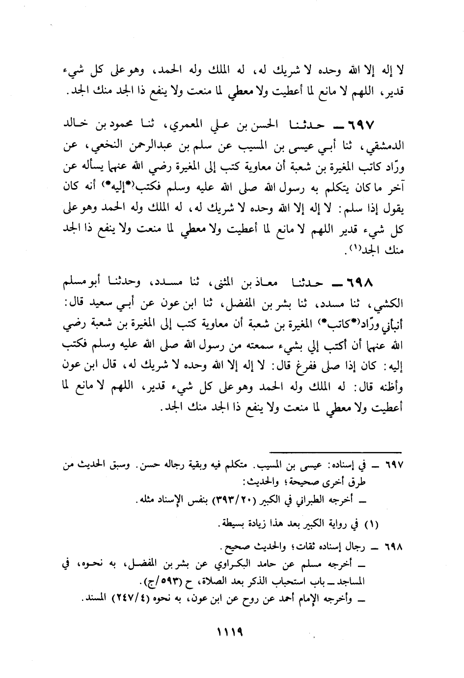 698- حَدَّثَنَا مُعَاذُ بْنُ الْمُثَنَّى، حَدَّثَنَا مُسَدَّدٌ، وَحَدَّثَنَا أَبُو مُسْلِمٍ الْكَشِّيُّ، حَدَّثَنَا مُسَدَّدٌ، حَدَّثَنَا بِشْرُ بْنُ الْمُفَضَّلِ، حَدَّثَنَا ابْنُ عَوْنٍ، عَنْ أَبِي سَعِيدٍ، قَالَ: أَنْبَأَنِي وَرَّادٌ كَاتِبُ الْمُغِيرَةِ بْنِ شُعْبَةَ, أَنَّ مُعَاوِيَةَ كَتَبَ إِلَى الْمُغِيرَةِ بْنِ شُعْبَةَ رَضِيَ اللَّهُ عَنْهُمَا: أَنِ اكْتُبْ إِلَيَّ بِشَيْءٍ سَمِعْتَهُ مِنْ رَسُولِ اللهِ صَلى الله عَلَيه وَسَلم، فَكَتَبَ إِلَيْهِ: كَانَ إِذَا صَلَّى فَفَرَغَ قَالَ: لاَ إِلَهَ إِلاَّ اللَّهُ وَحْدَهُ لاَ شَرِيكَ لَهُ, قَالَ ابْنُ عَوْنٍ: وَأَظُنُّهُ قَالَ: لَهُ الْمُلْكُ وَلَهُ الْحَمْدُ وَهُوَ عَلَى كُلِّ شَيْءٍ قَدِيرٌ، اللَّهُمَّ لاَ مَانِعَ لِمَا أَعْطَيْتَ، وَلاَ مُعْطِيَ لِمَا مَنَعْتَ، وَلاَ يَنْفَعُ ذَا الْجَدِّ مِنْكَ الْجَدُّ.