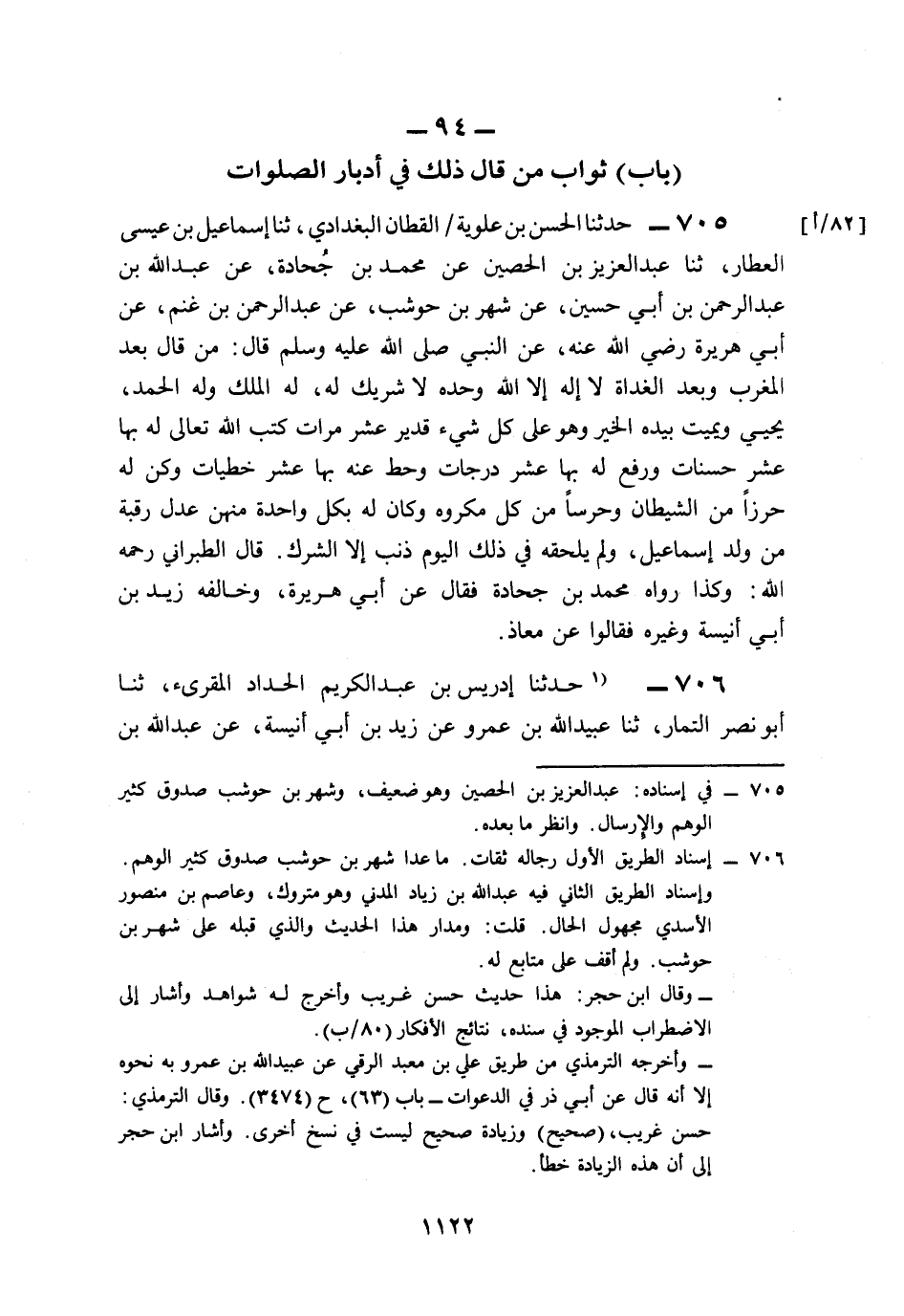 705- حَدَّثَنَا الْحَسَنُ بْنُ عَلُّويْة الْقَطَّانُ الْبَغْدَادِيُّ، حَدَّثَنَا إِسْمَاعِيلُ بْنُ عِيسَى الْعَطَّارُ، حَدَّثَنَا عَبْدُ الْعَزِيزِ بْنُ الْحُصَيْنِ، عَنْ مُحَمَّدِ بْنِ جُحَادَةَ، عَنْ عَبْدِ اللهِ بْنِ عَبْدِ الرَّحْمَنِ بْنِ أَبِي حُسَيْنٍ، عَنْ شَهْرِ بْنِ حَوْشَبٍ، عَنْ عَبْدِ الرَّحْمَنِ بْنِ غَنْمٍ، عَنْ أَبِي هُرَيْرَةَ، رَضِيَ اللَّهُ عَنْهُ, عَنِ النَّبِيِّ صَلى الله عَلَيه وَسَلم قَالَ: مَنْ قَالَ بَعْدَ الْمَغْرِبِ وَبَعْدَ الْغَدَاةِ: لاَ إِلَهَ إِلاَّ اللَّهُ وَحْدَهُ لاَ شَرِيكَ لَهُ، لَهُ الْمُلْكُ وَلَهُ الْحَمْدُ يُحْيِي وَيُمِيتُ بِيَدِهِ الْخَيْرُ وَهُوَ عَلَى كُلِّ شَيْءٍ قَدِيرٌ عَشْرَ مَرَّاتٍ, كَتَبَ اللَّهُ تَعَالَى لَهُ بِهَا عَشْرَ حَسَنَاتٍ، وَرَفَعَ لَهُ بِهَا عَشْرَ دَرَجَاتٍ، وَحَطَّ عَنْهُ بِهَا عَشْرَ خَطِيَّاتٍ، وَكُنَّ لَهُ حِرْزًا مِنَ الشَّيْطَانِ، وَحَرَسًا مِنْ كُلِّ مَكْرُوهٍ، وَكَانَ لَهُ بِكُلِّ وَاحِدَةٍ مِنْهُنَّ عَدْلُ رَقَبَةٍ مِنْ وَلَدِ إِسْمَاعِيلَ، وَلَمْ يَلْحَقْهُ فِي ذَلِكَ الْيَوْمِ ذَنْبٌ, إِلاَّ الشِّرْكُ.