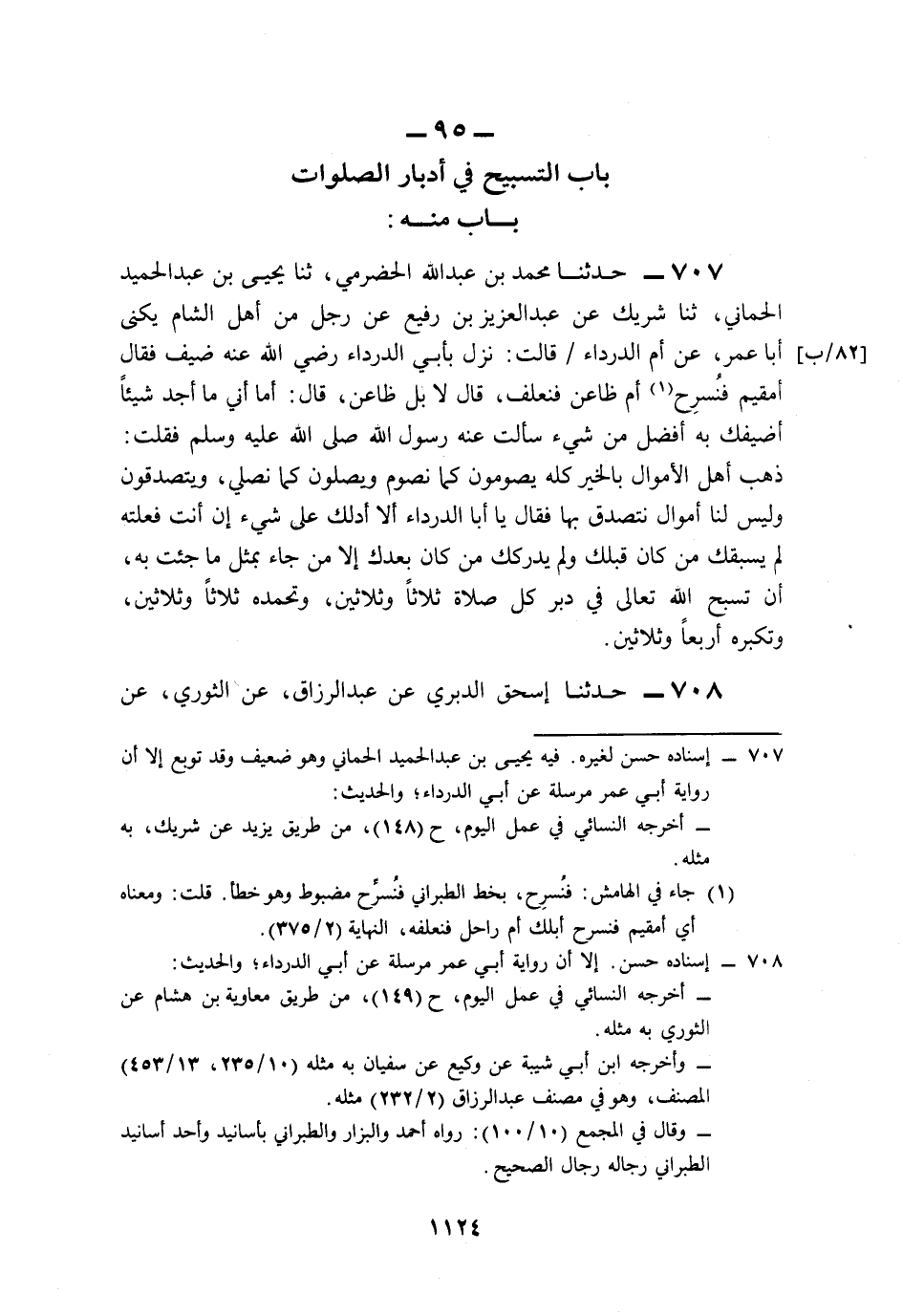 707- حَدَّثَنَا مُحَمَّدُ بْنُ عَبْدِ اللهِ الْحَضْرَمِيُّ، حَدَّثَنَا يَحْيَى بْنُ عَبْدِ الْحَمِيدِ الْحِمَّانِيُّ، حَدَّثَنَا شَرِيكٌ، عَنْ عَبْدِ الْعَزِيزِ بْنِ رُفَيْعٍ، عَنْ رَجُلٍ مِنْ أَهْلِ الشَّامِ, يُكْنَى: أَبَا عُمَرَ عَنْ أُمِّ الدَّرْدَاءِ، قَالَتْ: نَزَلَ بِأَبِي الدَّرْدَاءِ رَضِيَ اللَّهُ عَنْهُ ضَيْفٌ, فَقَالَ: أَمُقِيمٌ فَنُسَرِّحُ, أَمْ ظَاعِنٌ فَنَعْلِفُ؟ قَالَ: لاَ، بَلْ ظَاعِنٌ، قَالَ: أَمَا أَنِّي مَا أَجِدُ شَيْئًا أُضِيفُكَ بِهِ أَفْضَلَ مِنْ شَيْءٍ سَأَلْتُ عَنْهُ رَسُولَ اللهِ صَلى الله عَلَيه وَسَلم, فَقُلْتُ: ذَهَبَ أَهْلُ الأَمْوَالِ بِالْخَيْرِ كُلِّهِ؛ يَصُومُونَ كَمَا نَصُومُ، وَيُصَلُّونَ كَمَا نُصَلِّي، وَيَتَصَدَّقُونَ, وَلَيْسَ لَنَا أَمْوَالٌ نَتَصَدَّقُ بِهَا، فَقَالَ: يَا أَبَا الدَّرْدَاءِ، أَلاَ أَدُلُّكَ عَلَى شَيْءٍ إِنْ أَنْتَ فَعَلْتَهُ لَمْ يَسْبِقْكَ مَنْ كَانَ قَبْلَكَ, وَلَمْ يُدْرِكْكَ مَنْ كَانَ بَعْدَكَ, إِلاَّ مَنْ جَاءَ بِمِثْلِ مَا جِئْتَ بِهِ؟ أَنْ تُسَبِّحَ اللَّهَ تَعَالَى فِي دُبُرِ كُلِّ صَلاَةٍ ثَلاَثًا وَثَلاَثِينَ، وَتَحْمَدَهُ ثَلاَثًا وَثَلاَثِينَ، وَتُكَبِّرَهُ أَرْبَعًا وَثَلاَثِينَ.