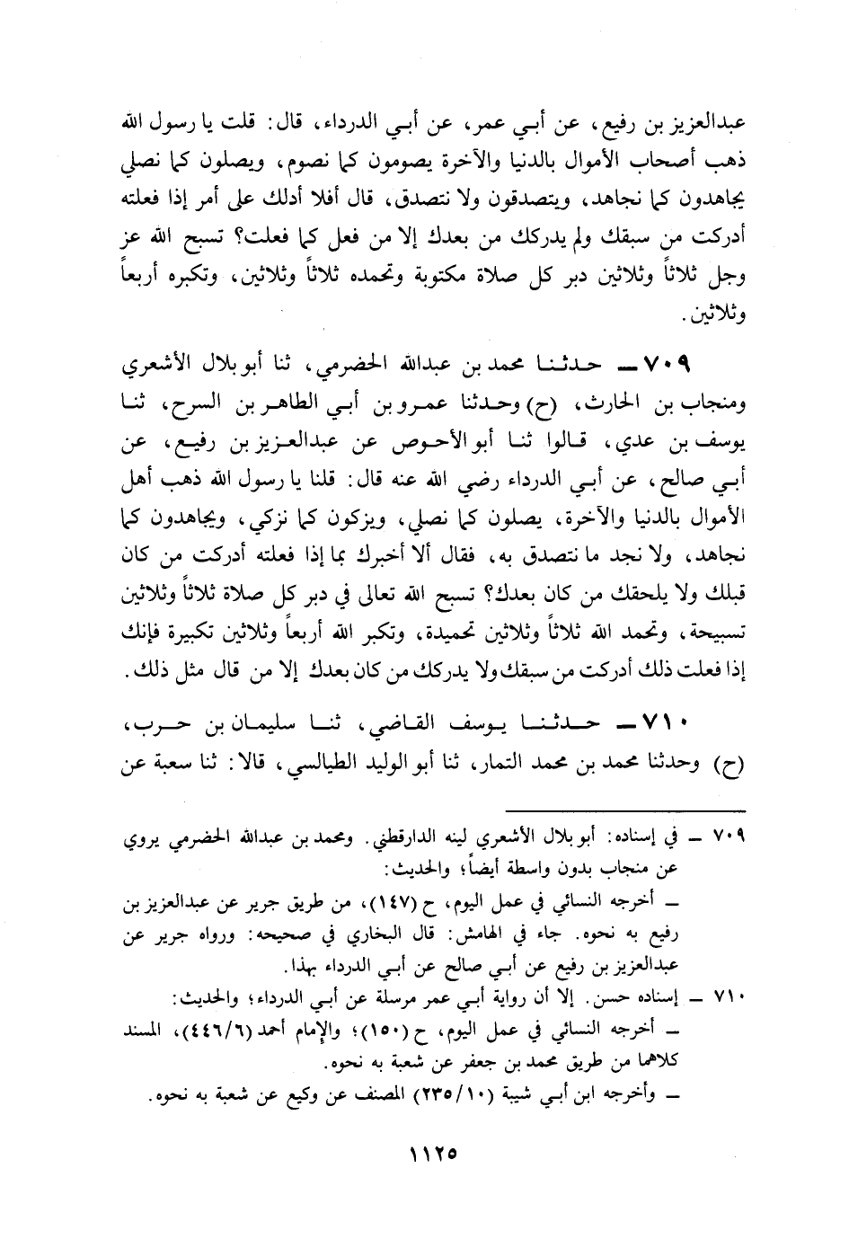 709- حَدَّثَنَا مُحَمَّدُ بْنُ عَبْدِ اللهِ الْحَضْرَمِيُّ، حَدَّثَنَا أَبُو بِلاَلٍ الأَشْعَرِيُّ، وَمِنْجَابُ بْنُ الْحَارِثِ (ح) وَحَدَّثَنَا عَمْرُو بْنُ أَبِي الطَّاهِرِ بْنُ السَّرْحِ، حَدَّثَنَا يُوسُفُ بْنُ عَدِيٍّ، قَالُوا: حَدَّثَنَا أَبُو الأَحْوَصِ، عَنْ عَبْدِ الْعَزِيزِ بْنِ رُفَيْعٍ، عَنْ أَبِي صَالِحٍ، عَنْ أَبِي الدَّرْدَاءِ، رَضِيَ اللَّهُ عَنْهُ قَالَ: قُلْنَا: يَا رَسُولَ اللهِ, ذَهَبَ أَهْلُ الأَمْوَالِ بِالدُّنْيَا وَالآخِرَةِ؛ يُصَلُّونَ كَمَا نُصَلِّي، وَيُزَكُّونَ كَمَا نُزَكِّي، وَيُجَاهِدُونَ كَمَا نُجَاهِدُ، وَلاَ نَجِدُ مَا نَتَصَدَّقُ بِهِ، فَقَالَ: أَلاَ أُخْبِرُكَ بِمَا إِذَا فَعَلْتَهُ أَدْرَكْتَ مَنْ كَانَ قَبْلَكَ, وَلاَ يَلْحَقْكَ مَنْ كَانَ بَعْدَكَ, تُسَبِّحُ اللَّهَ تَعَالَى فِي دُبُرِ كُلِّ صَلاَةٍ ثَلاَثًا وَثَلاَثِينَ تَسْبِيحَةً، وَتَحْمَدُ اللَّهَ ثَلاَثًا وَثَلاَثِينَ تَحْمِيدَةً، وَتُكَبِّرُ اللَّهَ أَرْبَعًا وَثَلاَثِينَ تَكْبِيرَةً، فَإِنَّكَ إِذَا فَعَلْتَ ذَلِكَ أَدْرَكْتَ مَنْ سَبَقَكَ, وَلاَ يُدْرِكَكَ مَنْ كَانَ بَعْدَكَ, إِلاَّ مَنْ قَالَ مِثْلَ ذَلِكَ.