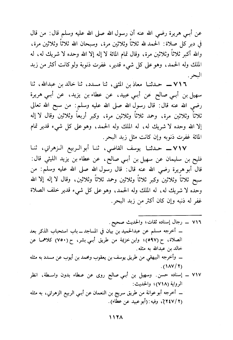 716- حَدَّثَنَا مُعَاذُ بْنُ الْمُثَنَّى، حَدَّثَنَا مُسَدَّدٌ، حَدَّثَنَا خَالِدُ بْنُ عَبْدِ اللهِ، حَدَّثَنَا سُهَيْلُ بْنُ أَبِي صَالِحٍ، عَنْ أَبِي عُبَيْدٍ، عَنْ عَطَاءِ بْنِ يَزِيدَ، عَنْ أَبِي هُرَيْرَةَ، رَضِيَ اللَّهُ عَنْهُ قَالَ: قَالَ رَسُولُ اللهِ صَلى الله عَلَيه وَسَلم: مَنْ سَبَّحَ اللَّهَ تَعَالَى ثَلاَثًا وَثَلاَثِينَ مَرَّةً، وَحَمِدَ ثَلاَثًا وَثَلاَثِينَ مَرَّةً، وَكَبَّرَ أَرْبَعًا وَثَلاَثِينَ، وَقَالَ: لاَ إِلَهَ إِلاَّ اللَّهُ وَحْدَهُ لاَ شَرِيكَ لَهُ، لَهُ الْمُلْكُ وَلَهُ الْحَمْدُ وَهُوَ عَلَى كُلِّ شَيْءٍ قَدِيرٌ، تَمَامَ الْمِئَةِ, غُفِرَتْ ذُنُوبُهُ, وَإِنْ كَانَتْ مِثْلَ زَبَدِ الْبَحْرِ.