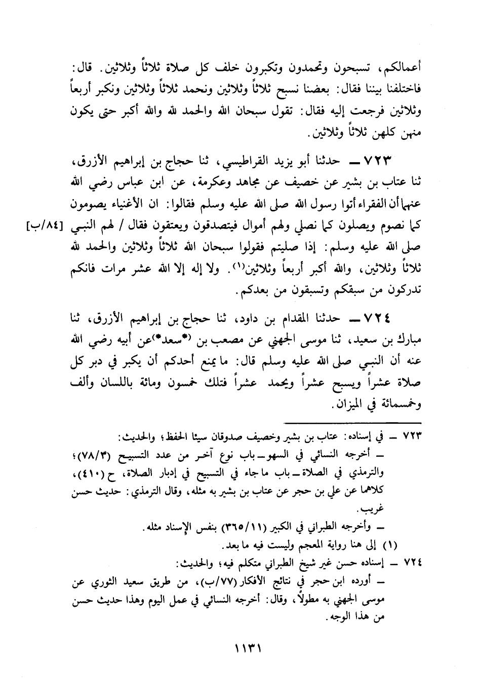 723- حَدَّثَنَا أَبُو يَزِيدَ الْقَرَاطِيسِيُّ، حَدَّثَنَا حَجَّاجُ بْنُ إِبْرَاهِيمَ الأَزْرَقُ، حَدَّثَنَا عَتَّابُ بْنُ بَشِيرٍ، عَنْ خُصَيْفٍ، عَنْ مُجَاهِدٍ، وَعِكْرِمَةَ، عَنِ ابْنِ عَبَّاسٍ، رَضِيَ اللَّهُ عَنْهُمَا, أَنَّ الْفُقَرَاءَ أَتَوْا رَسُولَ اللهِ صَلى الله عَلَيه وَسَلم فَقَالُوا: إِنَّ الأَغْنِيَاءَ يَصُومُونَ كَمَا نَصُومُ، وَيُصَلُّونَ كَمَا نُصَلِّي، وَلَهُمْ أَمْوَالٌ فَيَتَصَدَّقُونَ, وَيُعْتِقُونَ، فَقَالَ لَهُمُ النَّبِيُّ صَلى الله عَلَيه وَسَلم: إِذَا صَلَّيْتُمْ فَقُولُوا: سُبْحَانَ اللهِ ثَلاَثًا وَثَلاَثِينَ، وَالْحَمْدُ لِلَّهِ ثَلاَثًا وَثَلاَثِينَ، وَاللَّهُ أَكْبَرُ أَرْبَعًا وَثَلاَثِينَ، وَلاَ إِلَهَ إِلاَّ اللَّهُ عَشْرَ مَرَّاتٍ, فَإِنَّكُمْ تُدْرِكُونَ مَنْ سَبَقَكُمْ, وَتَسْبِقُونَ مَنْ بَعْدَكُمْ.