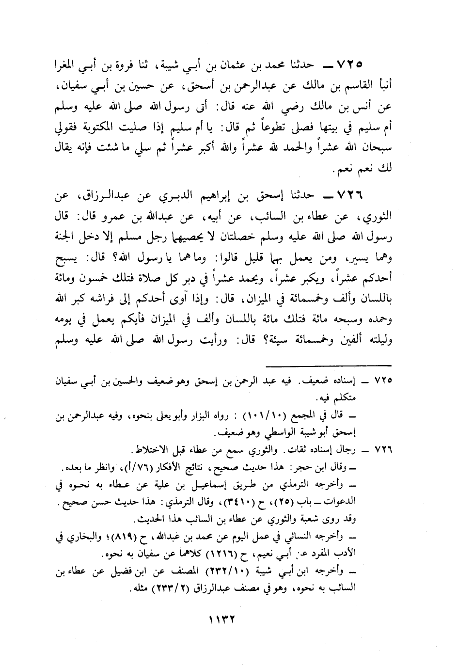 726- حَدَّثَنَا إِسْحَاقُ بْنُ إِبْرَاهِيمَ الدَّبَرِيُّ، عَنْ عَبْدِ الرَّزَّاقِ، عَنِ الثَّوْرِيِّ، عَنْ عَطَاءِ بْنِ السَّائِبِ، عَنْ أَبِيهِ، عَنْ عَبْدِ اللهِ بْنِ عَمْرٍو، قَالَ: قَالَ رَسُولُ اللهِ صَلى الله عَلَيه وَسَلم: خَصْلَتَانِ لاَ يُحْصِيهِمَا رَجُلٌ مُسْلِمٌ, إِلاَّ دَخَلَ الْجَنَّةَ, وَهُمَا يَسِيرٌ، وَمَنْ يَعْمَلُ بِهِمَا قَلِيلٌ, قَالُوا: وَمَا هُمَا يَا رَسُولَ اللهِ؟ قَالَ: يُسَبِّحُ أَحَدُكُمْ عَشْرًا، وَيُكَبِّرُ عَشْرًا، وَيَحْمَدُ عَشْرًا, فِي دُبُرِ كُلِّ صَلاَةٍ، فَتِلْكَ خَمْسُونَ وَمِئَةٌ بِاللِّسَانِ, وَأَلْفٌ وَخَمْسُمِئَةٍ فِي الْمِيزَانِ, قَالَ: وَإِذَا آوَى أَحَدُكُمْ إِلَى فِرَاشِهِ كَبَّرَ اللَّهَ وَحَمِدَهُ وَسَبَّحَهُ مِئَةً, فَتِلْكَ مِئَةٌ بِاللِّسَانِ, وَأَلْفٌ فِي الْمِيزَانِ، فَأَيُّكُمْ يَعْمَلُ فِي يَوْمِهِ وَلَيْلَتِهِ أَلْفَيْنِ وَخَمْسُمِئَةِ سَيِّئَةٍ, قَالَ: وَرَأَيْتُ رَسُولَ اللهِ صَلى الله عَلَيه وَسَلم يَعُدُّهُنَّ هَكَذَا, وَعَقَدَ بِأَصَابِعِهِ، قَالُوا: يَا رَسُولَ اللهِ, وَكَيْفَ لاَ نُحْصِيهَا؟ قَالَ: يَأْتِي أَحَدُكُمُ الشَّيْطَانُ فِي صَلاَتِهِ, فَيَقُولُ لَهُ: اذْكُرْ حَاجَةَ كَذَا وَحَاجَةَ كَذَا، حَتَّى يَنْصَرِفَ وَلَمْ يَذْكُرْ، وَيَأْتِيهِ عِنْدَ مَنَامَهُ, فَيُنَوِّمُهُ حَتَّى لاَ يَذْكُرَ.