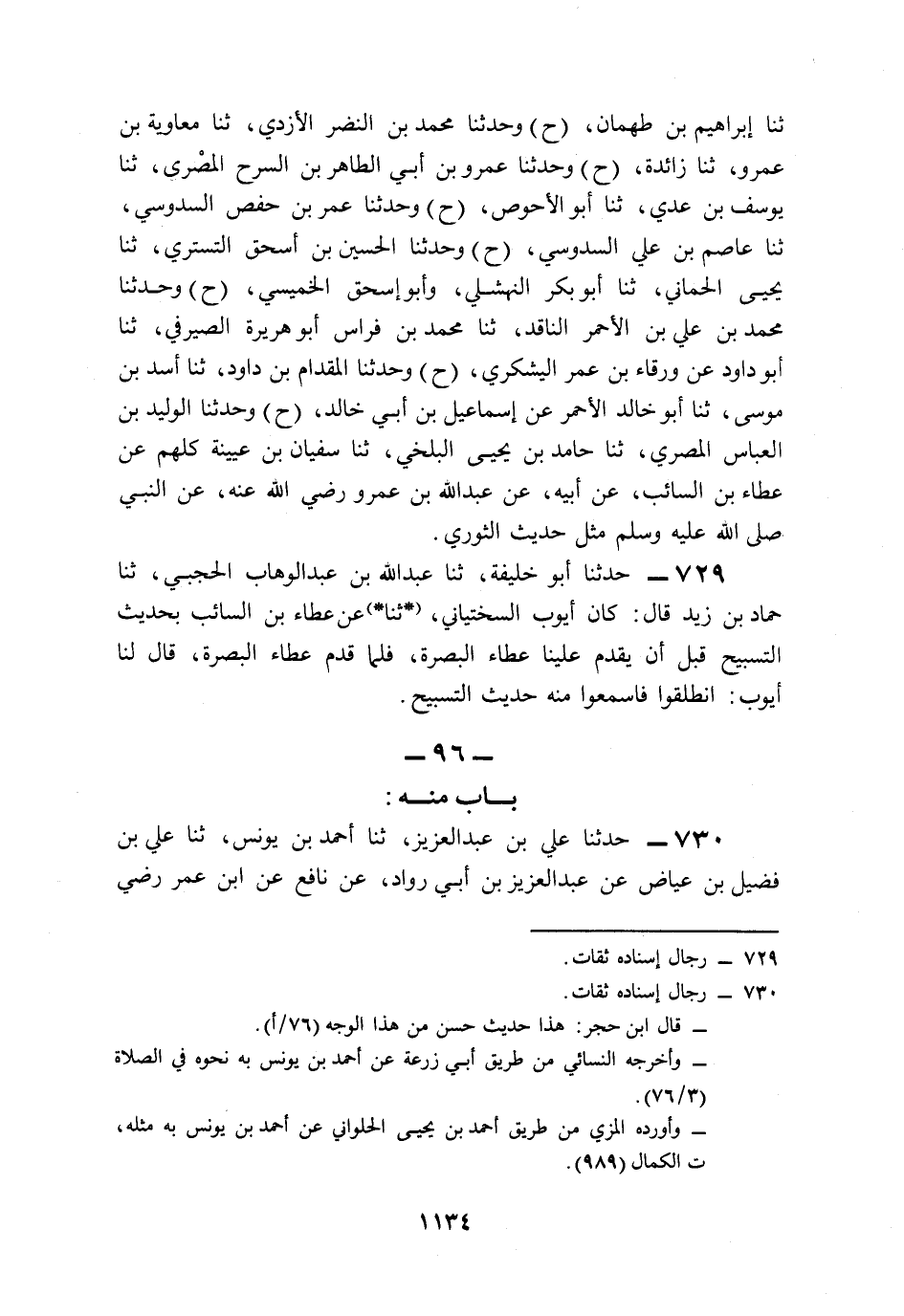 729- حَدَّثَنَا أَبُو خَلِيفَةَ، حَدَّثَنَا عَبْدُ اللهِ بْنُ عَبْدِ الْوَهَّابِ الْحَجَبِيُّ، حَدَّثَنَا حَمَّادُ بْنُ زَيْدٍ، قَالَ: كَانَ أَيُّوبُ السَّخْتِيَانِيُّ حدثَنَا عَنْ عَطَاءُ بْنُ السَّائِبِ بِحَدِيثِ التَّسْبِيحِ قَبْلَ أَنْ يَقْدَمَ عَلَيْنَا عَطَاءٌ الْبَصْرَةَ, فَلَمَّا قَدِمَ عَطَاءٌ الْبَصْرَةَ, قَالَ لَنَا أَيُّوبُ: انْطَلِقُوا, فَاسْمَعُوا مِنْهُ حَدِيثَ التَّسْبِيحِ.