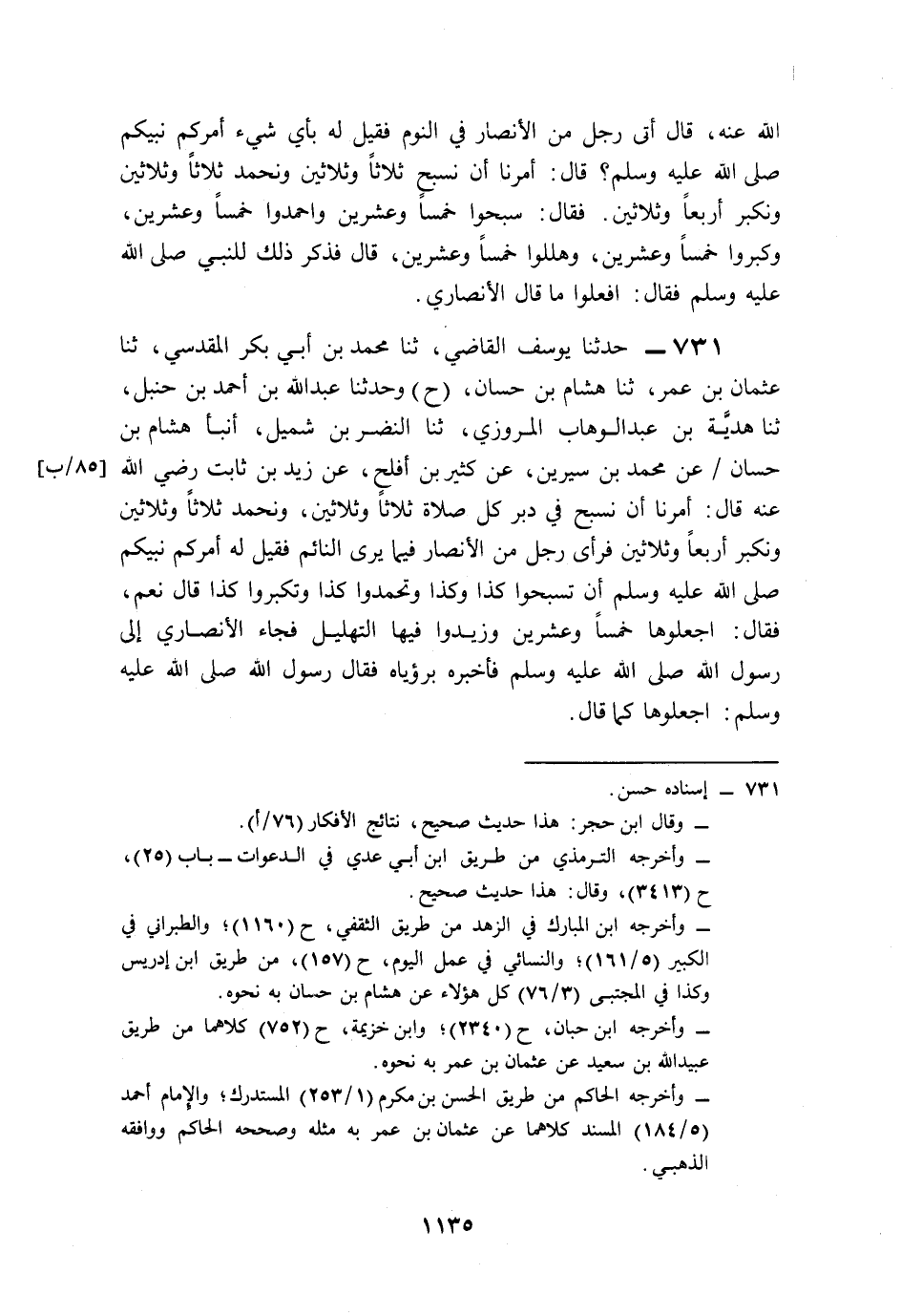731- حَدَّثَنَا يُوسُفُ الْقَاضِي، حَدَّثَنَا مُحَمَّدُ بْنُ أَبِي بَكْرٍ الْمُقَدِّمِيُّ (1)، حَدَّثَنَا عُثْمَانُ بْنُ عُمَرَ، حَدَّثَنَا هِشَامُ بْنُ حَسَّانَ (ح) وَحَدَّثَنَا عَبْدُ اللهِ بْنُ أَحْمَدَ بْنِ حَنْبَلٍ، حَدَّثَنَا هَدِيَّةُ بْنُ عَبْدِ الْوَهَّابِ الْمَرْوَزِيُّ، حَدَّثَنَا النَّضْرُ بْنُ شُمَيْلٍ، أَخْبَرَنَا هِشَامُ بْنُ حَسَّانَ، عَنْ مُحَمَّدِ بْنِ سِيرِينَ، عَنْ كَثِيرِ بْنِ أَفْلَحَ، عَنْ زَيْدِ بْنِ ثَابِتٍ، رَضِيَ اللَّهُ عَنْهُ قَالَ: أُمِرْنَا أَنْ نُسَبِّحَ فِي دُبُرِ كُلِّ صَلاَةٍ ثَلاَثًا وَثَلاَثِينَ، وَنَحْمَدَ ثَلاَثًا وَثَلاَثِينَ، وَنُكَبِّرَ أَرْبَعًا وَثَلاَثِينَ، فَرَأَى رَجُلٌ مِنَ الأَنْصَارِ فِيمَا يَرَى النَّائِمُ، فَقِيلَ لَهُ: أَمَرَكُمْ نَبِيُّكُمْ صَلى الله عَلَيه وَسَلم أَنْ تُسَبِّحُوا كَذَا وَكَذَا، وَتَحْمَدُوا كَذَا، وَتُكَبِّرُوا كَذَا؟ قَالَ: نَعَمْ، فَقَالَ: اجْعَلُوهَا خَمْسًا وَعِشْرِينَ, وَزِيدُوا فِيهَا التَّهْلِيلَ، فَجَاءَ الأَنْصَارِيُّ إِلَى رَسُولِ اللهِ صَلى الله عَلَيه وَسَلم, فَأَخْبَرَهُ بِرُؤْيَاهُ، فَقَالَ رَسُولُ اللهِ صَلى الله عَلَيه وَسَلم: اجْعَلُوهَا كَمَا قَالَ.