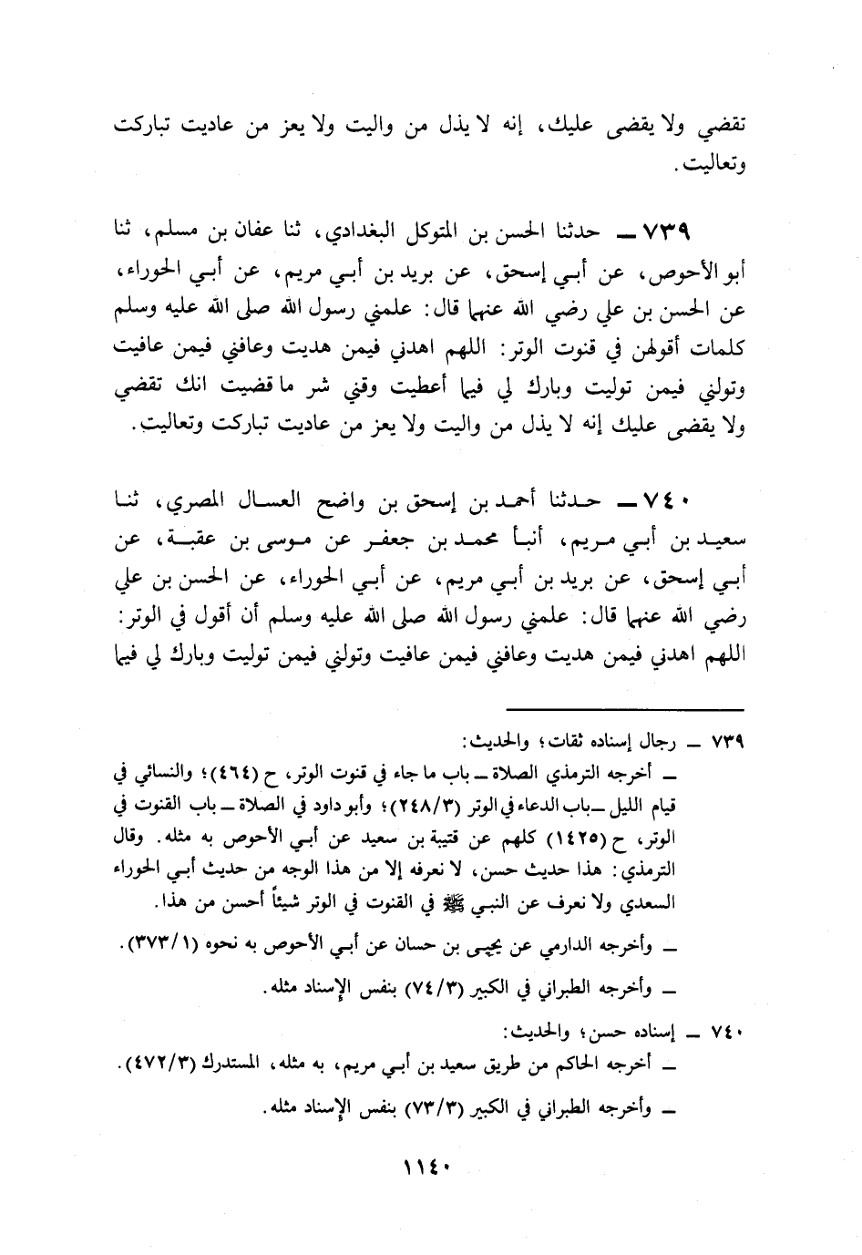 739- حَدَّثَنَا الْحَسَنُ بْنُ الْمُتَوَكِّلِ الْبَغْدَادِيُّ، حَدَّثَنَا عَفَّانُ بْنُ مُسْلِمٍ، حَدَّثَنَا أَبُو الأَحْوَصِ، عَنْ أَبِي إِسْحَاقَ، عَنْ بُرَيْدِ بْنِ أَبِي مَرْيَمَ، عَنْ أَبِي الْحَوْرَاءِ، عَنِ الْحَسَنِ بْنِ عَلِيٍّ، رَضِيَ اللَّهُ عَنْهُمَا قَالَ: عَلَّمَنِي رَسُولُ اللهِ صَلَّى اللَّهُ عَلَيْهِ وَسلَّمَ كَلِمَاتٍ أَقُولُهُنَّ فِي قُنُوتِ الْوِتْرِ: اللَّهُمَّ اهْدِنِي فِيمَنْ هَدَيْتَ، وَعَافِنِي فِيمَنْ عَافَيْتَ، وَتَوَلَّنِي فِيمَنْ تَوَلَّيْتَ، وَبَارِكْ لِي فِيمَا أَعْطَيْتَ، وَقِنِي شَرَّ مَا قَضَيْتَ، إِنَّكَ تَقْضِي وَلاَ يُقْضَى عَلَيْكَ، إِنَّهُ لاَ يَذِلُّ مَنْ وَالَيْتَ، وَلاَ يَعِزُّ مَنْ عَادَيْتَ, تَبَارَكْتَ وَتَعَالَيْتَ.