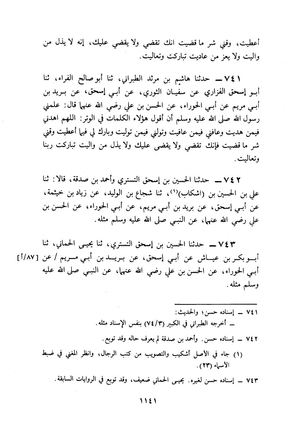 741- حَدَّثَنَا هَاشِمُ بْنُ مَرْثَدٍ الطَّبَرَانِيُّ، حَدَّثَنَا أَبُو صَالِحٍ الْفَرَّاءُ، حَدَّثَنَا أَبُو إِسْحَاقَ الْفَزَارِيُّ، عَنْ سُفْيَانَ الثَّوْرِيِّ، عَنْ أَبِي إِسْحَاقَ، عَنْ بُرَيْدِ بْنِ أَبِي مَرْيَمَ، عَنْ أَبِي الْحَوْرَاءِ، عَنِ الْحَسَنِ بْنِ عَلِيٍّ، رَضِيَ اللَّهُ عَنْهُمَا قَالَ: عَلَّمَنِي رَسُولُ اللهِ صَلى الله عَلَيه وَسَلم أَنْ أَقُولَ هَؤُلاَءِ الْكَلِمَاتِ فِي الْوِتْرِ: اللَّهُمَّ اهْدِنِي فِيمَنْ هَدَيْتَ، وَعَافِنِي فِيمَنْ عَافَيْتَ، وَتَوَلَّنِي فِيمَنْ تَوَلَّيْتَ، وَبَارِكْ لِي فِيمَا أَعْطَيْتَ، وَقِنِي شَرَّ مَا قَضَيْتَ، فَإِنَّكَ تَقْضِي وَلاَ يُقْضَى عَلَيْكَ، وَلاَ يَذِلُّ مَنْ وَالَيْتَ، تَبَارَكْتَ رَبَّنَا وَتَعَالَيْتَ.