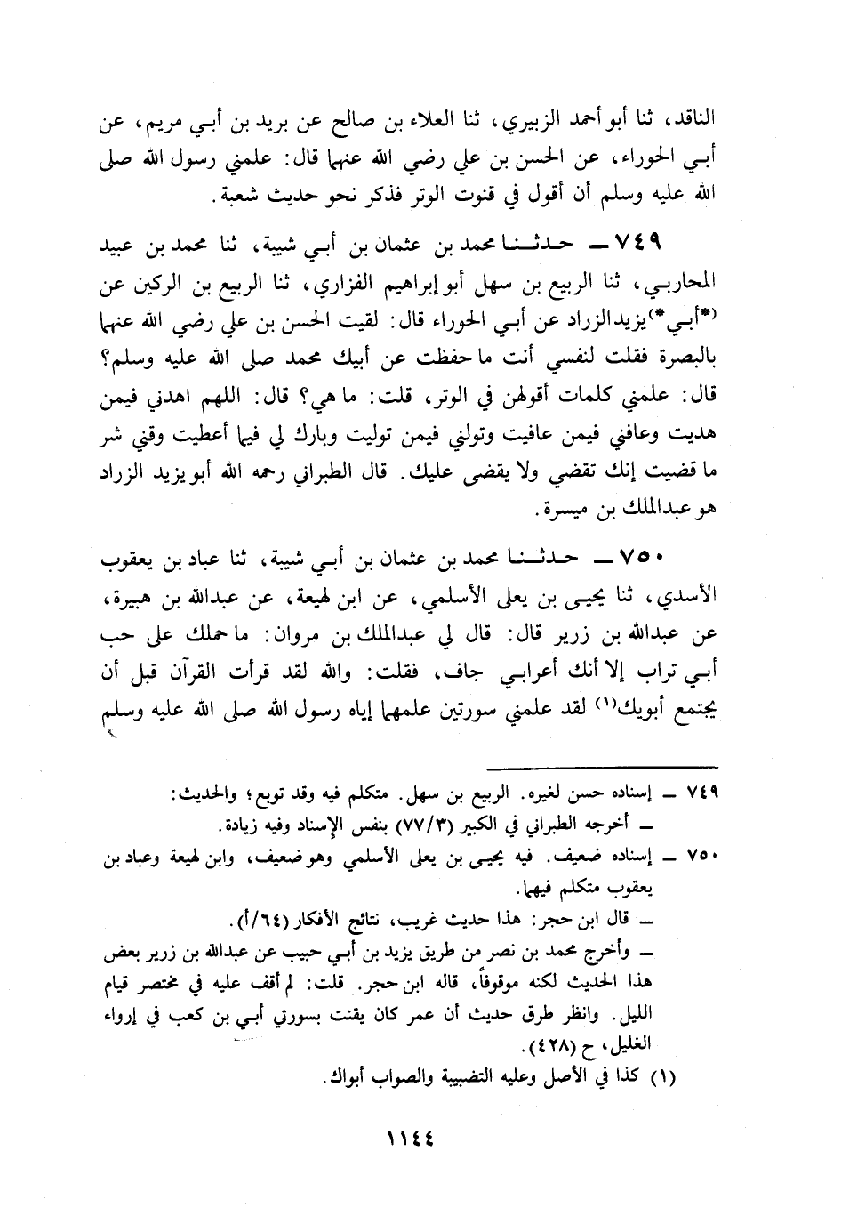 749- حَدَّثَنَا مُحَمَّدُ بْنُ عُثْمَانَ بْنِ أَبِي شَيْبَةَ، حَدَّثَنَا مُحَمَّدُ بْنُ عُبَيْدٍ الْمُحَارِبِيُّ، حَدَّثَنَا الرَّبِيعُ بْنُ سَهْلٍ, أَبُو إِبْرَاهِيمَ الْفَزَارِيُّ، حَدَّثَنَا الرَّبِيعُ بْنُ الرُّكَيْنِ، عَنْ أَبِي يَزِيدَ الزَّرَّادِ، عَنْ أَبِي الْحَوْرَاءِ، قَالَ: لَقِيتُ الْحَسَنَ بْنَ عَلِيٍّ رَضِيَ اللَّهُ عَنْهُمَا بِالْبَصْرَةِ, فَقُلْتُ لِنَفْسِي: أَنْتَ مَا حَفِظْتَ عَنْ أَبِيكِ مُحَمَّدٍ صَلَّى اللَّهُ عَلَيْهِ وَسَلَّمَ؟ قَالَ: عَلَّمَنِي كَلِمَاتٍ أَقُولُهُنَّ فِي الْوِتْرِ، قُلْتُ: مَا هِيَ؟ قَالَ: اللَّهُمَّ اهْدِنِي فِيمَنْ هَدَيْتَ، وَعَافِنِي فِيمَنْ عَافَيْتَ، وَتَوَلَّنِي فِيمَنْ تَوَلَّيْتَ، وَبَارِكْ لِي فِيمَا أَعْطَيْتَ، وَقِنِي شَرَّ مَا قَضَيْتَ، إِنَّكَ تَقْضِي وَلاَ يُقْضَى عَلَيْكَ.