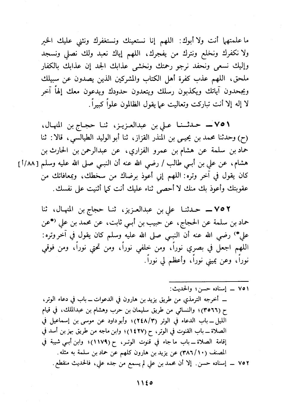 751- حَدَّثَنَا عَلِيُّ بْنُ عَبْدِ الْعَزِيزِ، حَدَّثَنَا حَجَّاجُ بْنُ الْمِنْهَالِ (ح) وَحَدَّثَنَا مُحَمَّدُ بْنُ يَحْيَى بْنِ الْمُنْذِرِ الْقَزَّازُ، حَدَّثَنَا أَبُو الْوَلِيدِ الطَّيَالِسِيُّ، قَالاَ: حَدَّثَنَا حَمَّادُ بْنُ سَلَمَةَ، عَنْ هِشَامِ بْنِ عَمْرٍو الْفَزَارِيُّ، عَنْ عَبْدِ الرَّحْمَنِ بْنِ الْحَارِثِ بْنِ هِشَامٍ، عَنْ عَلِيِّ بْنِ أَبِي طَالِبٍ، رَضِيَ اللَّهُ عَنْهُ, أَنَّ النَّبِيَّ صَلى الله عَلَيه وَسَلم كَانَ يَقُولُ فِي آخِرِ وِتْرِهِ: اللَّهُمَّ إِنِّي أَعُوذُ بِرِضَاكَ مِنْ سَخَطِكَ، وَبِمُعَافَاتِكَ مِنْ عُقُوبَتِكَ، وَأَعُوذُ بِكَ مِنْكَ، لاَ أُحْصِي ثَنَاءً عَلَيْكَ، أَنْتَ كَمَا أَثْنَيْتَ عَلَى نَفْسِكَ.