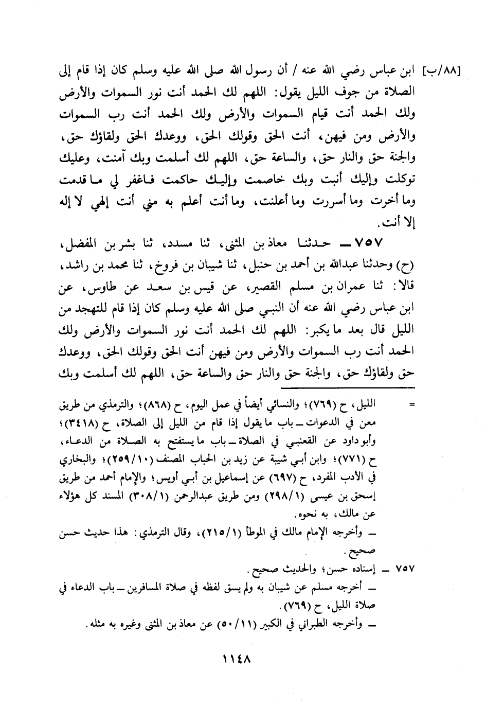 757- حَدَّثَنَا مُعَاذُ بْنُ الْمُثَنَّى، حَدَّثَنَا مُسَدَّدٌ، حَدَّثَنَا بِشْرُ بْنُ الْمُفَضَّلِ (ح) وَحَدَّثَنَا عَبْدُ اللهِ بْنُ أَحْمَدَ بْنِ حَنْبَلٍ، حَدَّثَنَا شَيْبَانُ بْنُ فَرُّوخَ، حَدَّثَنَا مُحَمَّدُ بْنُ رَاشِدٍ، قَالاَ: حَدَّثَنَا عِمْرَانُ بْنُ مُسْلِمٍ الْقَصِيرُ، عَنْ قَيْسِ بْنِ سَعْدٍ، عَنْ طَاوُوسٍ، عَنِ ابْنِ عَبَّاسٍ، رَضِيَ اللَّهُ عَنْهُ, أَنَّ النَّبِيَّ صَلى الله عَلَيه وَسَلم كَانَ إِذَا قَامَ لِلتَّهَجُّدِ مِنَ اللَّيْلِ, قَالَ بَعْدَ مَا يُكَبِّرُ: اللَّهُمَّ لَكَ الْحَمْدُ، أَنْتَ نُورُ السَّمَاوَاتِ وَالأَرْضِ، وَلَكَ الْحَمْدُ أَنْتَ رَبُّ السَّمَاوَاتِ وَالأَرْضِ وَمَنْ فِيهِنَّ، أَنْتَ الْحَقُّ، وَقَوْلُكَ الْحَقُّ، وَوَعْدُكَ حَقٌّ، وَلِقَاؤُكَ حَقٌّ، وَالْجَنَّةُ حَقٌّ، وَالنَّارُ حَقٌّ، وَالسَّاعَةُ حَقٌّ، اللَّهُمَّ لَكَ أَسْلَمْتُ، وَبِكَ آمَنْتُ، وَإِلَيْكَ أَنَبْتُ، وَعَلَيْكَ تَوَكَّلْتُ، وَبِكَ خَاصَمْتُ، وَإِلَيْكَ حَاكَمْتُ، وَإِلَيْكَ الْمَصِيرُ، اللَّهُمَّ اغْفِرْ لِي مَا قَدَّمْتُ وَمَا أَخَّرْتُ، وَمَا أَسْرَرْتُ وَمَا أَعْلَنْتُ، أَنْتَ إِلَهِي, لاَ إِلَهَ إِلاَّ أَنْتَ.