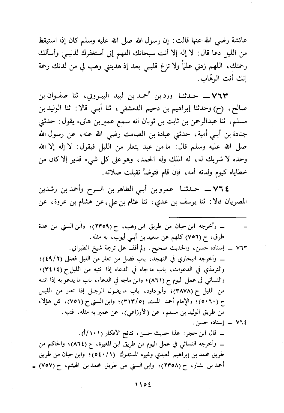 763- حَدَّثَنَا وَرْدُ بْنُ أَحْمَدَ بْنِ لَبِيدٍ الْبَيْرُوتِيُّ، حَدَّثَنَا صَفْوَانُ بْنُ صَالِحٍ (ح) وَحَدَّثَنَا إِبْرَاهِيمُ بْنُ دُحَيْمٍ الدِّمَشْقِيُّ، حَدَّثَنَا أَبِي، قَالاَ: حَدَّثَنَا الْوَلِيدُ بْنُ مُسْلِمٍ، حَدَّثَنَا عَبْدُ الرَّحْمَنِ بْنُ ثَابِتِ بْنِ ثَوْبَانَ، أَنَّهُ سَمِعَ عُمَيْرَ بْنَ هَانِئٍ، يَقُولُ: حَدَّثَنِي جُنَادَةُ بْنُ أَبِي أُمَيَّةَ، حَدَّثَنِي عُبَادَةُ بْنُ الصَّامِتِ، رَضِيَ اللَّهُ عَنْهُ, عَنْ رَسُولِ اللهِ صَلى الله عَلَيه وَسَلم قَالَ: مَا مِنْ عَبْدٍ يَتَعَارَّ مِنَ اللَّيْلِ, فَيَقُولُ: لاَ إِلَهَ إِلاَّ اللَّهُ وَحْدَهُ لاَ شَرِيكَ لَهُ، لَهُ الْمُلْكُ, وَلَهُ الْحَمْدُ وَهُوَ عَلَى كُلِّ شَيْءٍ قَدِيرٌ، إِلاَّ كَانَ مِنْ خَطَايَاهُ كَيَوْمَ وَلَدَتْهُ أُمُّهُ, فَإِنْ قَامَ فَتَوَضَّأَ, تُقُبِّلَتْ صَلاَتُهُ.