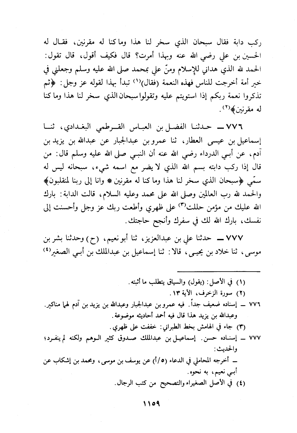 776- حَدَّثَنَا الْفَضْلُ بْنُ الْعَبَّاسِ الْقُرْطُمِيُّ الْبَغْدَادِيُّ، حَدَّثَنَا إِسْمَاعِيلُ بْنُ عِيسَى الْعَطَّارُ، حَدَّثَنَا عَمْرُو بْنُ عَبْدِ الْجَبَّارِ، عَنْ عَبْدِ اللهِ بْنِ يَزِيدَ بْنِ آدَمَ، عَنْ أَبِي الدَّرْدَاءِ، رَضِيَ اللَّهُ عَنْهُ, أَنَّ النَّبِيَّ صَلى الله عَلَيه وَسَلم قَالَ: مَنْ قَالَ إِذَا رَكِبَ دَابَّتَهُ: بِسْمِ اللهِ الَّذِي لاَ يَضُرُّ مَعَ اسْمِهِ شَيْءٌ، سُبْحَانَهُ لَيْسَ لَهُ سَمِيٌّ: {سُبْحَانَ الَّذِي سَخَّرَ لَنَا هَذَا وَمَا كُنَّا لَهُ مُقْرِنِينَ وَإِنَّا إِلَى رَبِّنَا لَمُنْقَلِبُونَ} وَالْحَمْدُ لِلهِ رَبِّ الْعَالَمِيِنَ, وَصَلَّى اللَّهُ عَلَى مُحَمَّدٍ وَعَلَيْهِ السَّلاَمُ، قَالَتِ الدَّابَّةُ: بَارَكَ اللَّهُ عَلَيْكَ مِنْ مُؤْمِنٍ, حَلَلْتَ عَلَى ظَهْرِي, وَأَطَعْتَ رَبَّكَ عَزَّ وَجَلَّ, وَأَحْسَنْتَ إِلَى نَفْسِكَ، بَارَكَ اللَّهُ لَكَ فِي سَفَرِكَ, وَأَنْجَحَ حَاجَتَكَ.